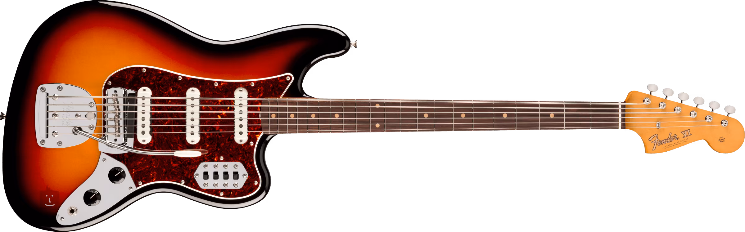 Drei Vintage-Style Early '60s Bass VI Single-Coil-Tonabnehmer verleihen der Bassgitarre einen tiefen, satten, artikulierten Klang mit Fender-DNA. Die Potentiometer fungieren als Master Volume und Tone, die Tonabnehmer werden über Schalter aktiviert, mit dem vierten Schalter wird der Bass-Cut-Schaltkreis aktiviert. Die Saiten werden in den firmeneigenen Stimmmechaniken im Vintage-Stil und über den Steg mit sechs Saitenreitern im Floating-Tremolo befestigt. Die stilvolle Verarbeitung wird durch ein vierlagiges Pickguard aus Imitations-Schildpatt unterstrichen.
