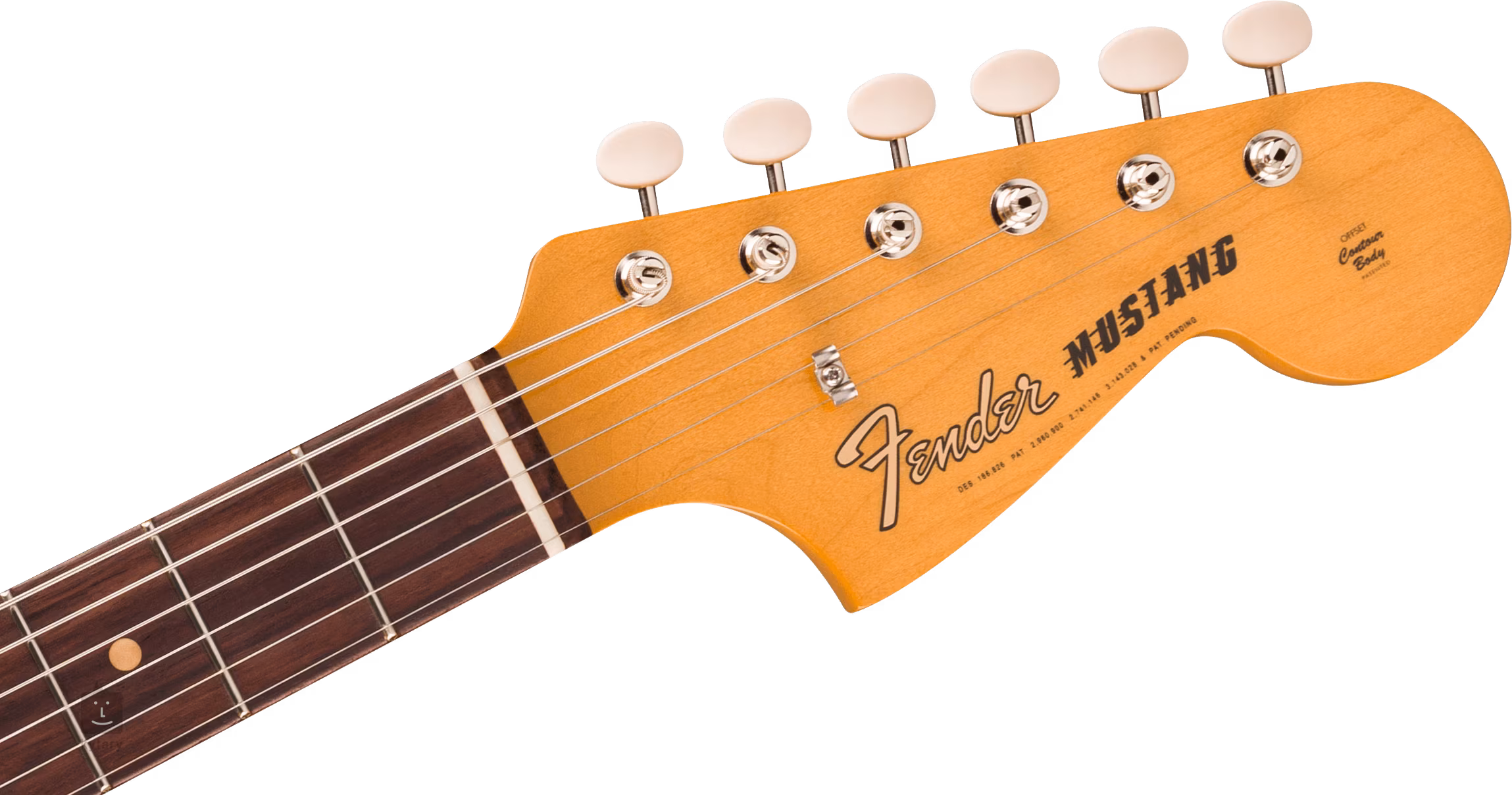 Der asymmetrisch geformte Korpus aus Erlenholz der Mustang-E-Gitarren ist mit glänzendem Polyesterlack überzogen. Der Ahornhals und das Griffbrett aus massivem Palisander (Slab Rosewood) basieren auf den Spezifikationen der Instrumente aus den 60er Jahren, d. h. sie bieten ein authentisches Mid '60s „C”-Halsprofil, einen 7,25-Zoll-Griffbrettradius und Vintage Tall-Bünde – keine Abweichungen von der Gegenwart. Die Orientierung auf dem Griffbrett erleichtern Positionierungspunkte aus vulkanisiertem Faserstoff (Clay Dots). Dank der kürzeren Mensur (610 mm) eignet sich die Mustang auch für Menschen mit kleineren Fingern.