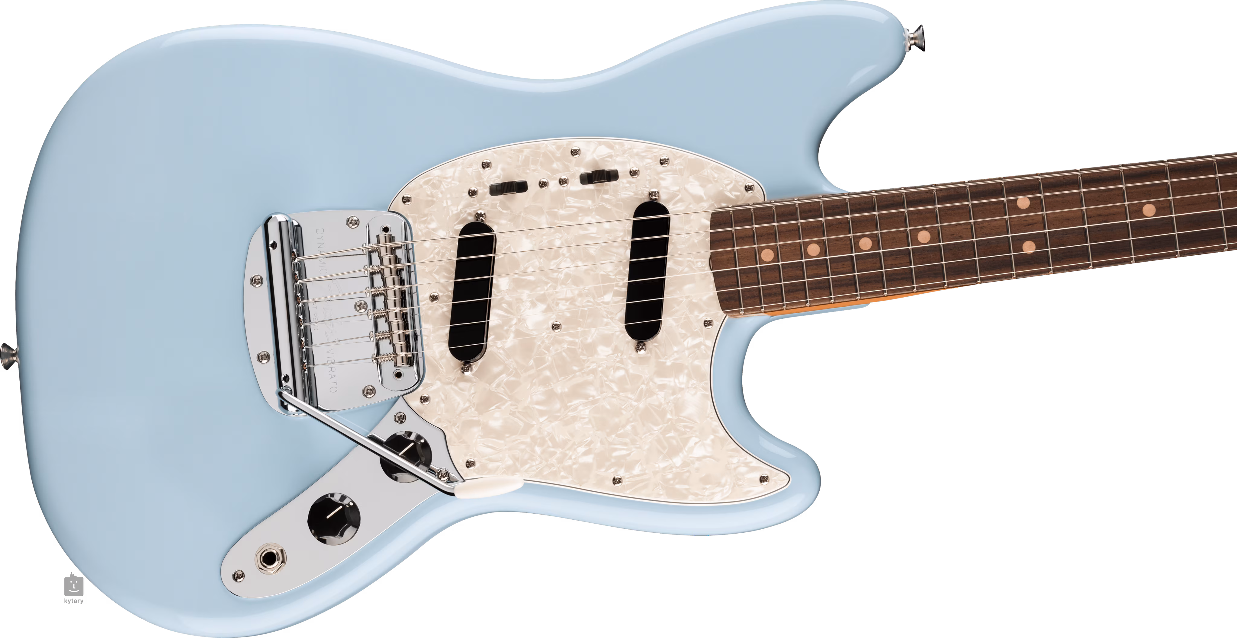 Zwei Vintage-Style Mid '60s Single-Coil-Mustang-Tonabnehmer verleihen der Gitarre einen lebendigen, warmen Klang mit klar erkennbarer Fender-DNA. Der Klangcharakter lässt sich mit den Potentiometern für Lautstärke und Tonregelung einstellen, zwischen den Tonabnehmern kann mit Zwei-Positionen-Schaltern umgeschaltet werden. Die Saiten werden über den Nulldaumen aus Knochen in Vintage-Style-Mechaniken und einem Mustang-Floating-Tremolo befestigt. Die stilvolle Verarbeitung wird durch ein vierlagiges Pickguard aus Perlmuttimitat (Aged White Pearloid) unterstrichen.