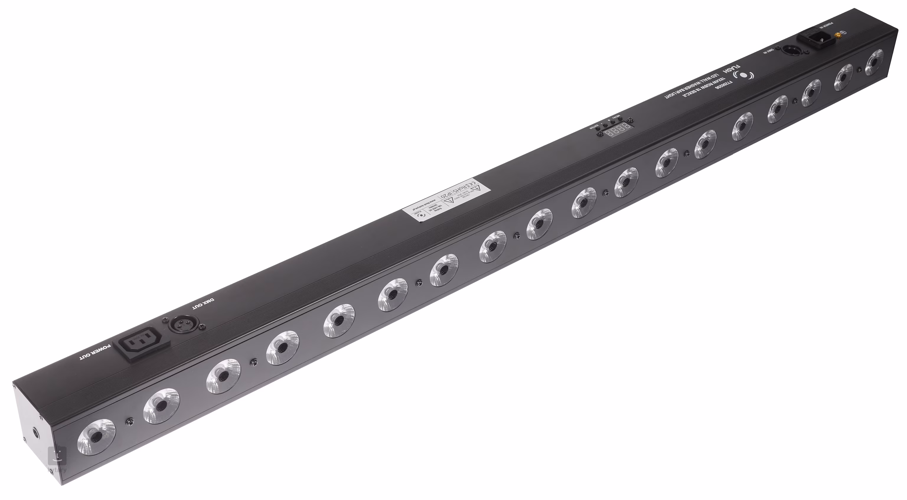 Die Steuerung erfolgt über das Standard-DMX-512-Protokoll, aber auch soundgesteuerte und automatische Programme oder der Master/Slave-Modus sind möglich. Manuelle Einstellungen werden über ein übersichtliches Bedienfeld mit Display und Tasten vorgenommen. Die Leiste bietet nur eine grundlegende Schutzart von IP20 und ist daher nicht für den Außeneinsatz geeignet. Ein Netzkabel und Montageteile sind im Lieferumfang enthalten. Das Gerät ist mit 3-poligen DMX-Anschlüssen und einem IEC-Stromanschluss ausgestattet. Die Konstruktion der Leiste besteht aus robustem Aluminium.