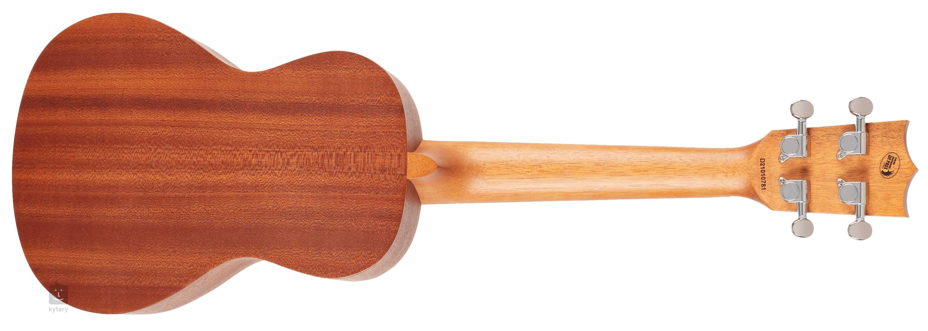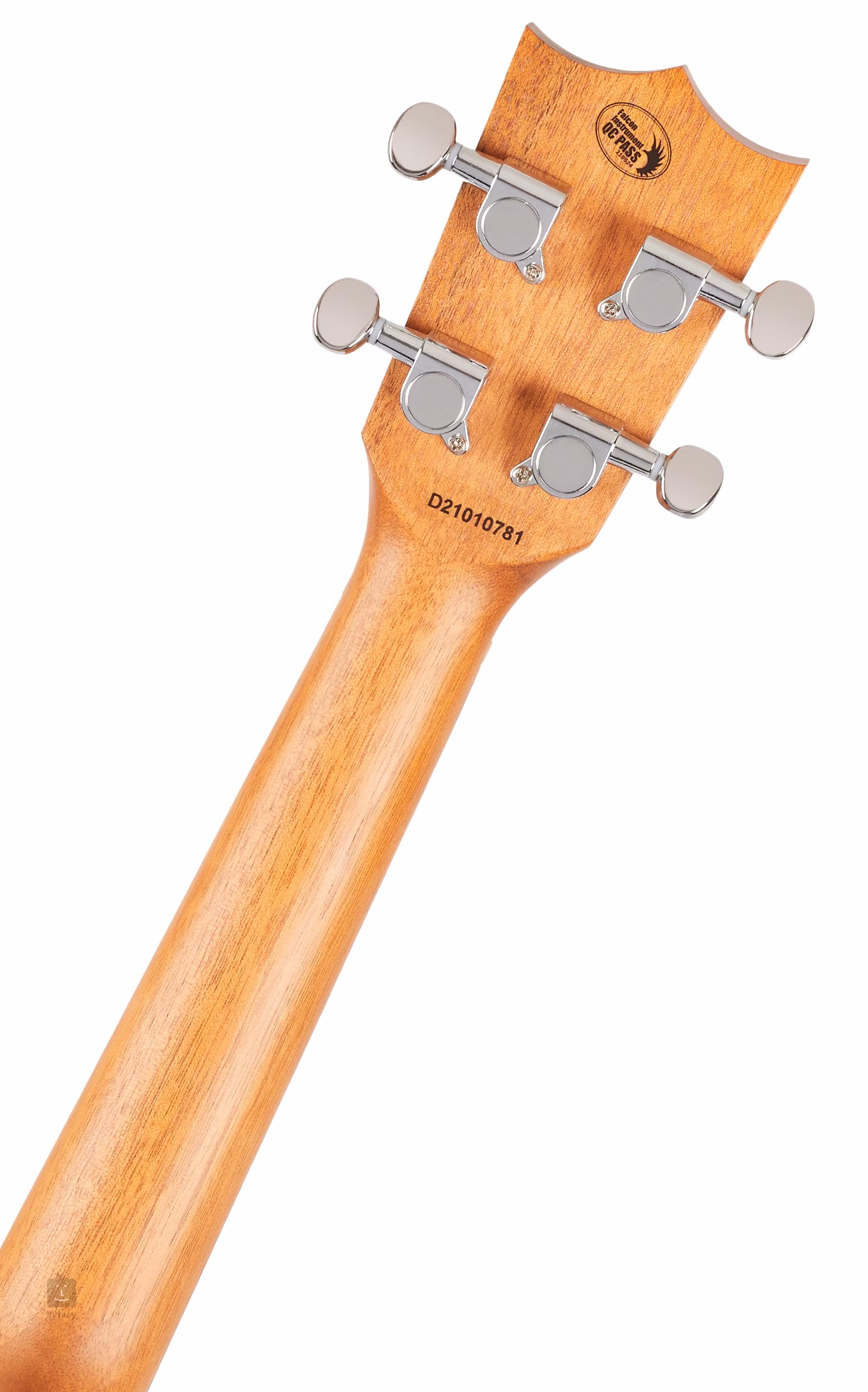 Die Vorderseite dieser Konzert-Ukulele besteht aus laminierter Fichte, während der Boden und die Zargen aus laminiertem Mahagoni gefertigt sind. Die natürliche Resonanz der Ukulele wird durch die leicht gewölbte Bodenplatte verstärkt. Hals und Griffbrett des Instruments bestehen aus afrikanischem Okoumé und Nussbaum, einer ebenfalls recht häufig verwendeten Holzkombination. Die Saiten sind über ein Griffbrett aus Knochen und einen Sattelbund in Geared-Mechaniken und einem Griffbrett aus Walnuss verankert.