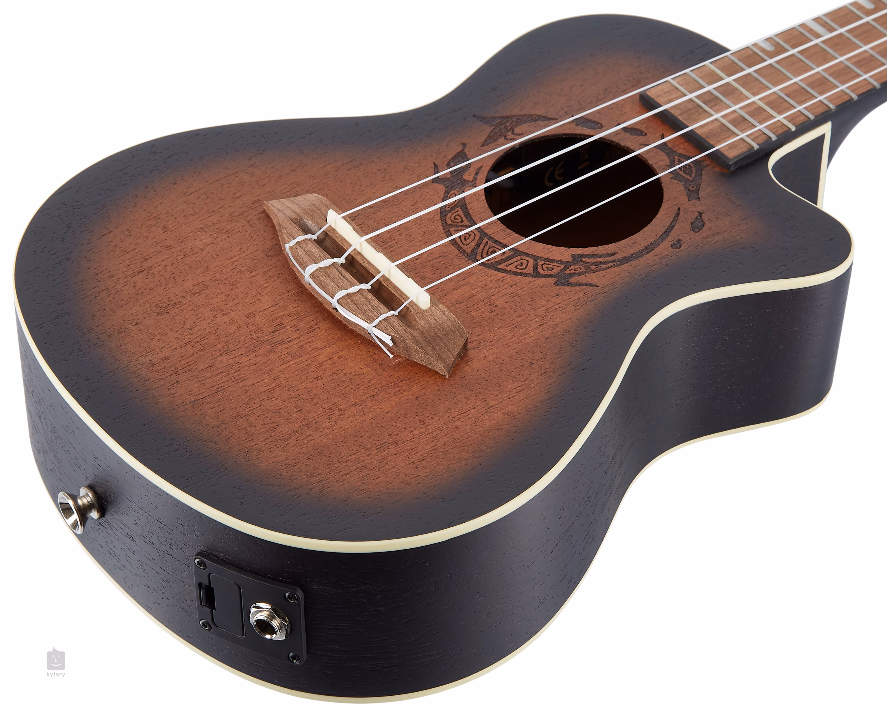 Der Korpus dieser elektroakustischen Konzert-Ukulele ist aus laminiertem Mahagoni gefertigt. Die natürliche Resonanz des Instruments wird durch die leicht gewölbte Bodenplatte der Ukulele verstärkt. Hals und Griffbrett des Instruments sind aus afrikanischem Okoumé und Nussbaum gefertigt, einer ebenfalls recht häufig verwendeten Holzkombination. Die Saiten sind über ein Griffbrett aus Knochen und einen Sattelbund in einem Die-Cast Geared Tuning Mechanismus und einem Griffbrett aus Walnuss verankert.