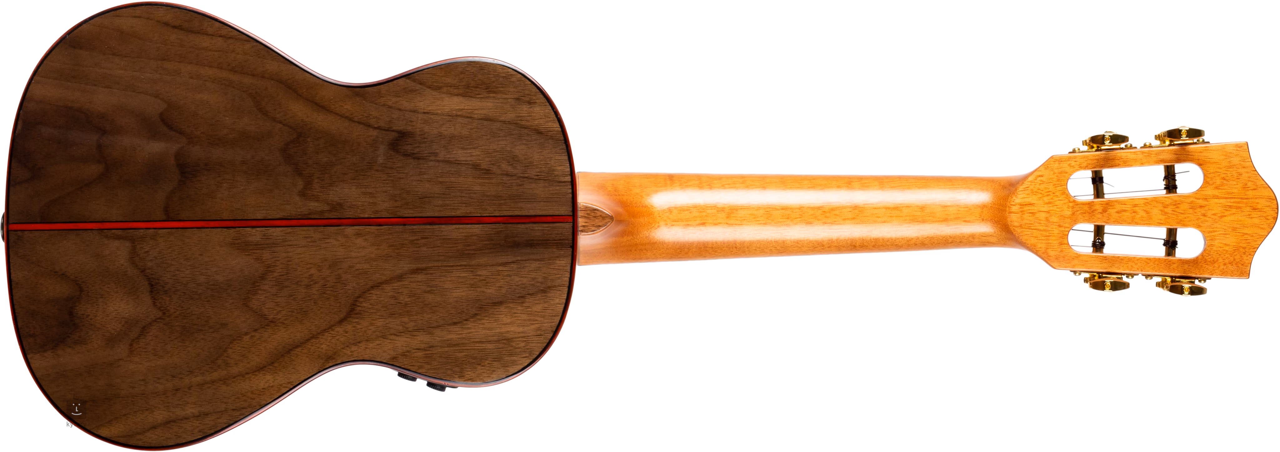 Die Vorderseite der Sophia-Konzert-Ukulele besteht aus massiver Fichte, während Boden und Zargen aus laminiertem Walnussholz gefertigt sind, dessen Maserung einen schönen Kontrast zur Fichtendecke bildet. Auf den Okoumé-Hals ist ein Griffbrett aus Purpleheart-Holz geklebt, das mit achtzehn Bünden versehen ist. Die Saiten sind an der Kopfplatte in einem klassischen geschlitzten Kopfplatten-Design über dem Sattel und dem Knochenbund befestigt. Die schöne Verarbeitung wird durch den glänzend lackierten Korpus, das doppelseitige Perimeter-Binding, die Palisander-Rosette und die goldene Hardware noch unterstrichen.