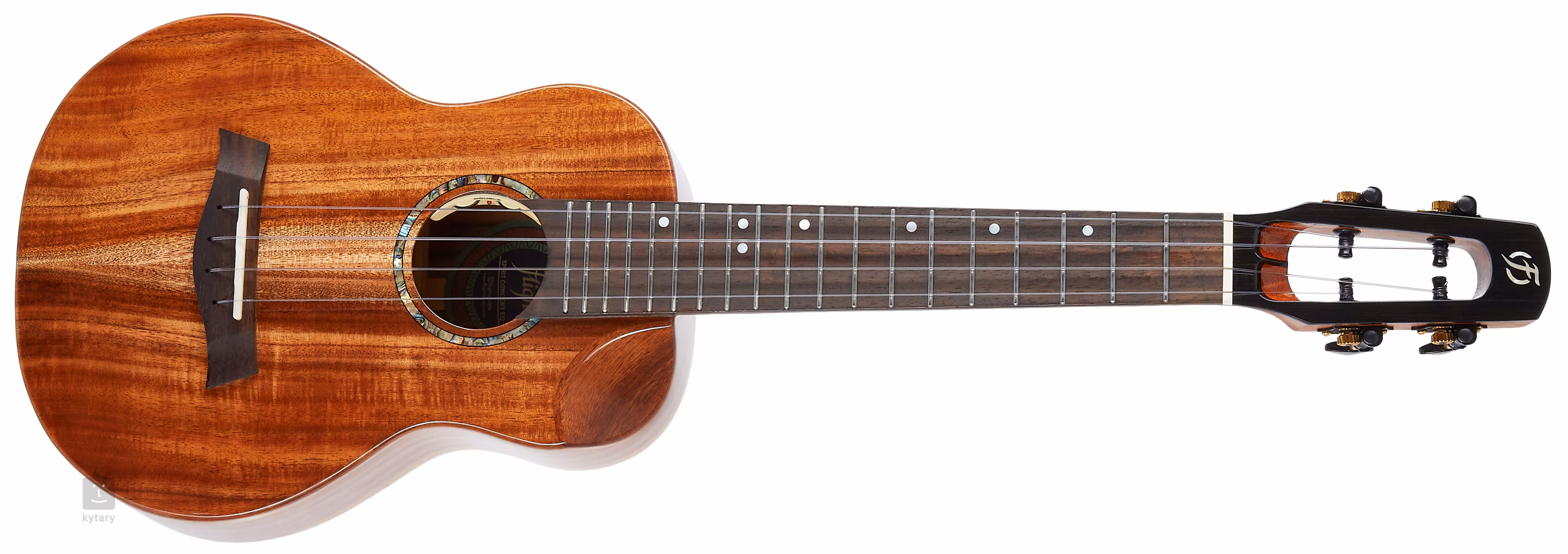 Stimmstabilität und exzellentes Sustain werden durch die Verankerung der Saiten durch den Sattel und den Knochenbund in den offenen Stimmmechaniken und den String-Through-Body garantiert, ein Konzept aus dem Gitarrenbau, bei dem die Saiten durch den Korpus und durch die Frontplatte der Ukulele befestigt werden. Die Qualität der Verarbeitung wird durch das moderne Kopfplattendesign, die glänzende Oberfläche der Decke und die traditionellen Merkmale wie die versetzten Positionsmarkierungen auf dem Palisandergriffbrett und die Perlmuttrosette deutlich.