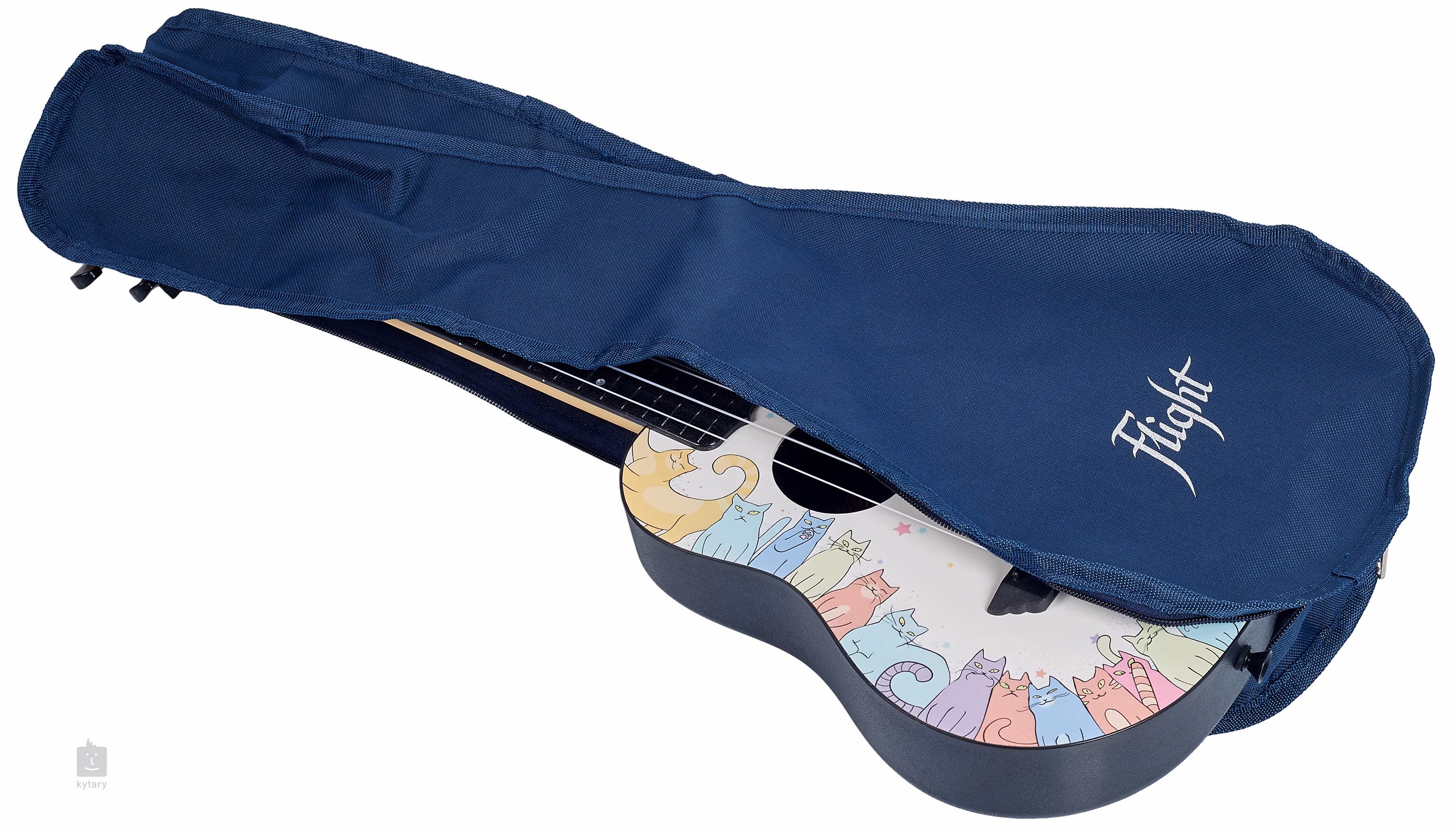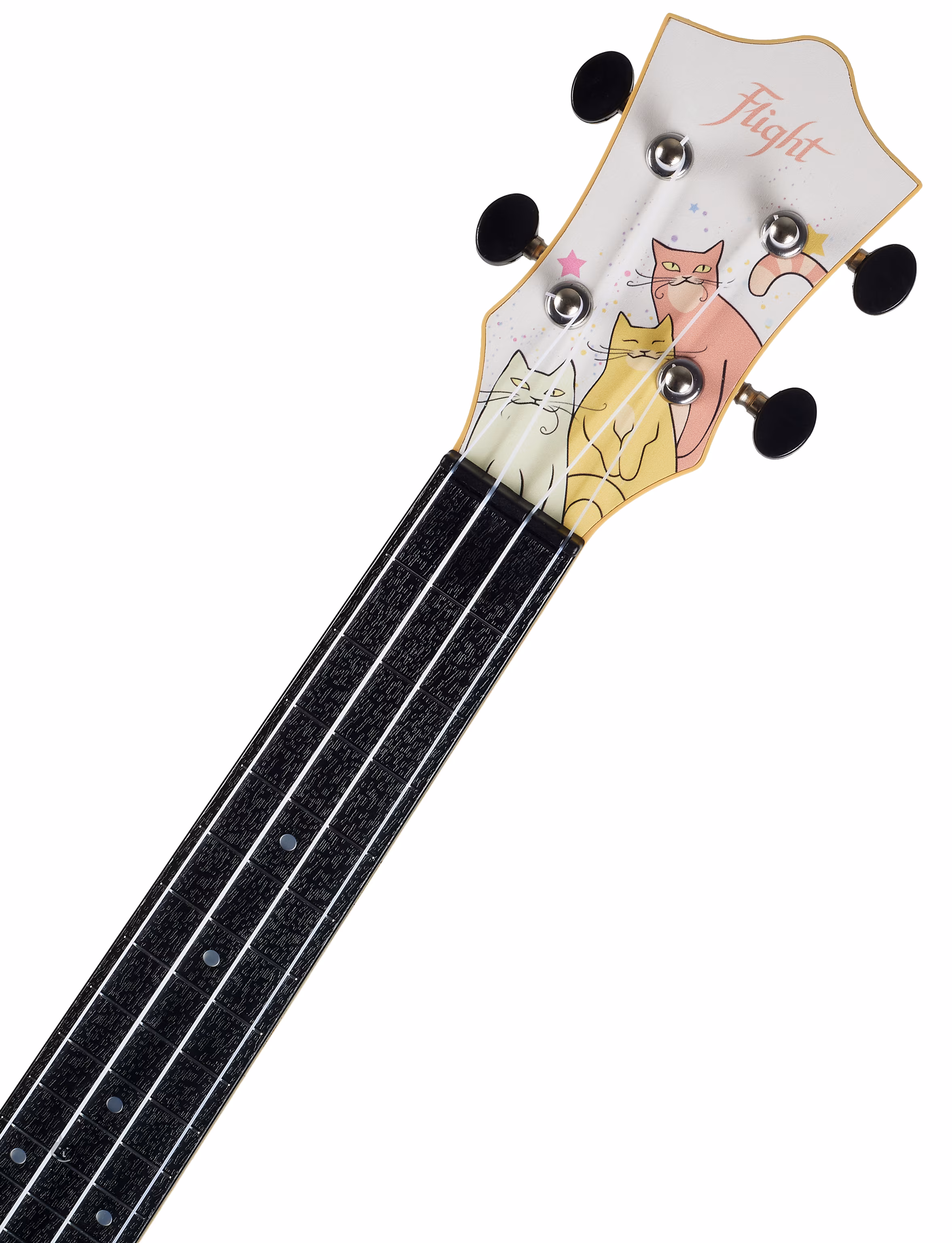 Der Korpus dieser Konzert-Ukulele besteht aus einem Kunststoffkorpus und einer laminierten Lindenholz-Resonanzdecke, die mit grafischen Motiven verziert ist, die Katzenliebhaber jeden Alters erfreuen werden. Die breitere gewölbte Bodenplatte der Ukulele lässt das Instrument klarer und lauter klingen als herkömmliche Konzertmodelle. Hals und Griffbrett sind ebenfalls aus ABS-Kunststoff gefertigt, wobei das Halsdesign die Textur von Holz imitiert. Die Saiten sind über Null- und Sattelbünde aus Kunststoff in gitarrenähnlichen Stimmmechaniken (Geared) und einer Kunststoffkopfplatte verankert. Das stilvolle Aussehen des Instruments wird durch das Limonenfurnier auf der Kopfplatte unterstrichen, das farblich auf das Finish der Decke abgestimmt ist.