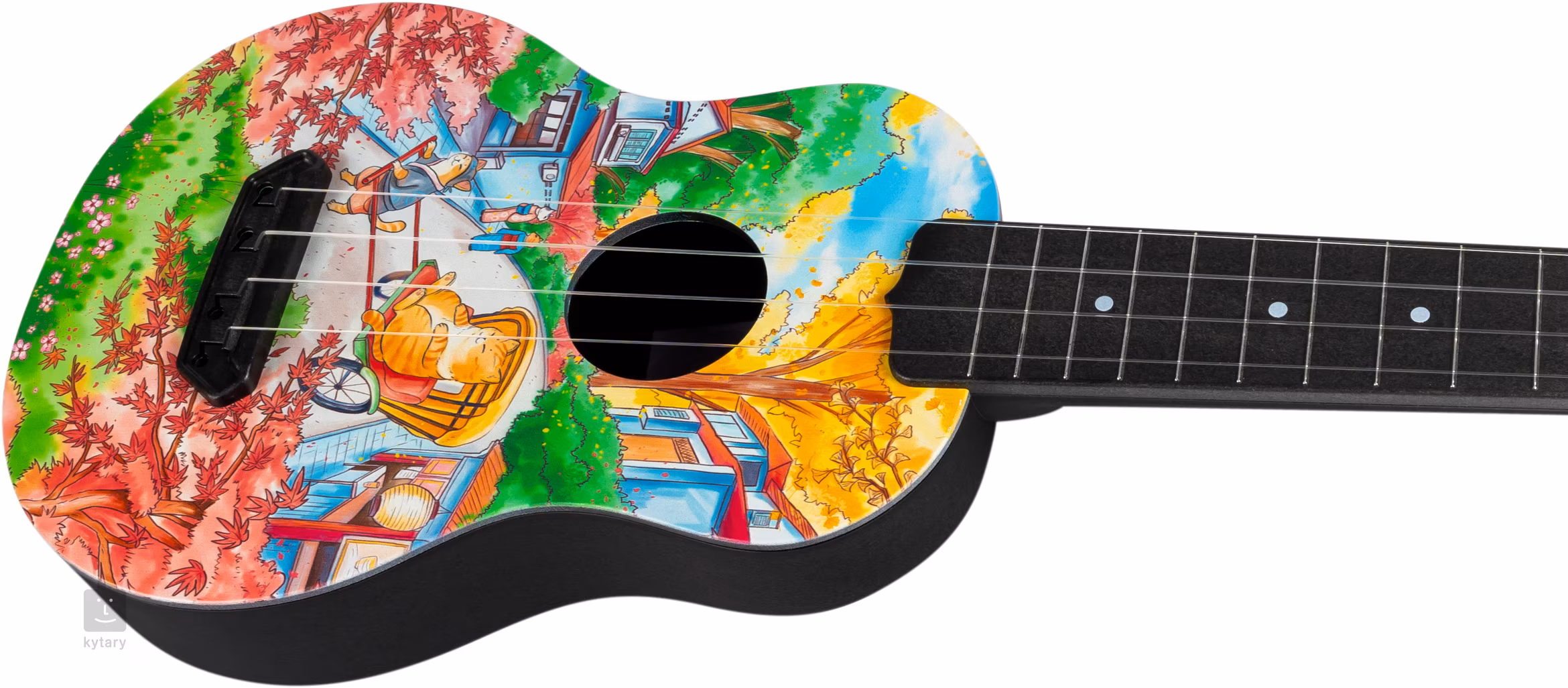 Die Saiten sind in gitarrenähnlichen Stimmmechanismen (Geared) und einer Kunststoffkopfplatte verankert. Grafische Motive/Drucke auf dem Resonanzboden und der Kopfplatte unterstreichen die schöne Verarbeitung. Aufgrund der robusten Kunststoffkonstruktion wird die Ukulele in einem einfachen Kordelzugkoffer/Rucksack geliefert. Ein Anleitungsheft ist im Lieferumfang enthalten.