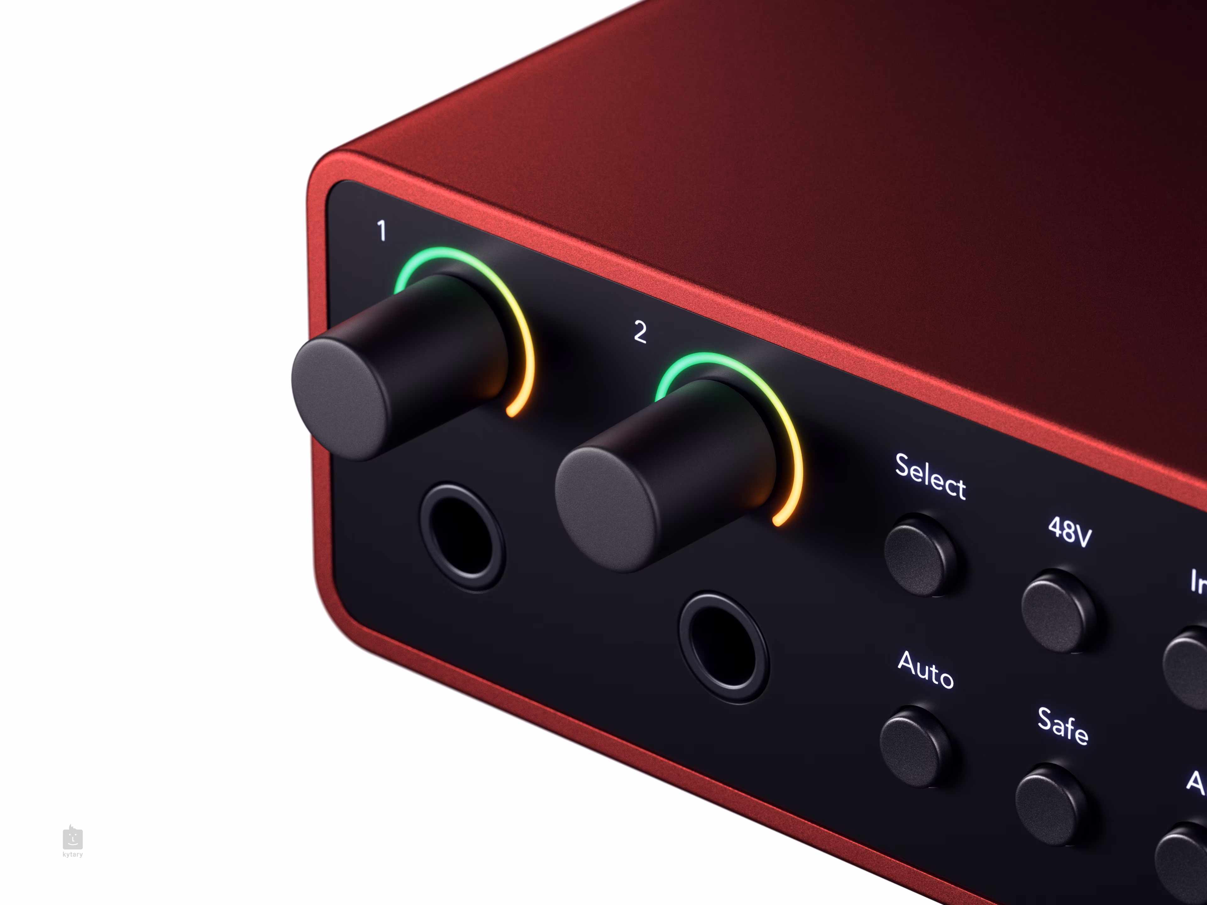 Die Funktionen Auto Gain, Clip Safe und Dynamic Halo helfen Ihnen bei der richtigen Einstellung des Vorverstärkers. Dynamic Halo ist eine einfache Lösung, um eine Übersteuerung des Signals anzuzeigen. Wenn die Hintergrundbeleuchtung rot ist, verringern Sie die Verstärkung, bis die Farbe grün ist. Bei den meisten Modellen (außer Scarlett Solo und Solo Studio) können Sie die Auto-Taste für die automatische Verstärkungseinstellung verwenden. Sie müssen nur ein paar Phrasen singen oder auf Ihrem Instrument spielen und schon sind Sie bereit für die Aufnahme. In Kombination mit der aktivierten Safe-Funktion kann es einfach nicht passieren, dass die Aufnahme am Eingang übersteuert wird.