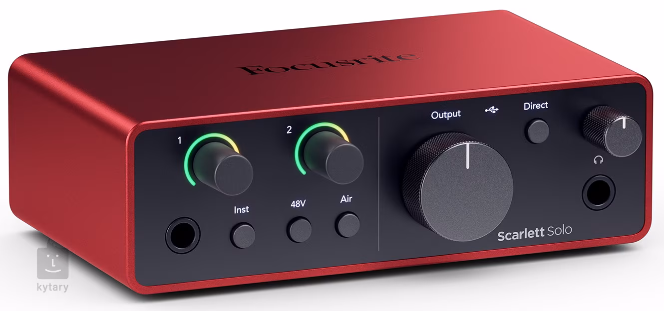 Focusrite Scarlett Solo 4th Generation ist ein zweikanaliges USB-C-Audio-Interface, das einen Mikrofonvorverstärker und einen Eingang für Line- oder Instrumentensignale, einen Stereoausgang zum Anschluss von Monitorlautsprechern und einen Kopfhörerausgang bietet.