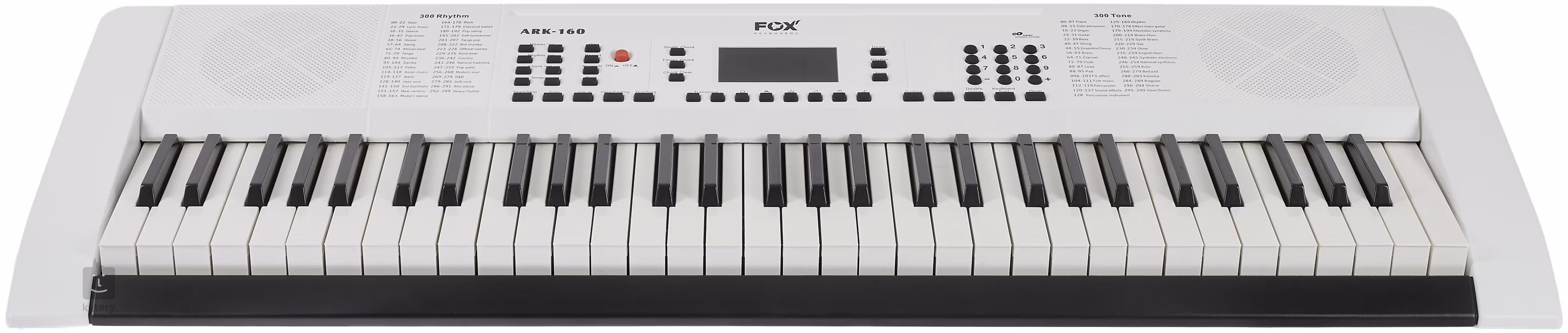 Das FOX 160 bietet 61 Tasten in Standardgröße, 128 Sounds und 128 Begleitautomatiken. Außerdem gibt es erweiterte Funktionen wie Split (Aufteilung der Tastatur, um zwei Instrumente gleichzeitig zu spielen), Dual Voice (Überlagerung von Klängen) sowie Sustaine (Hall) und Vibrato-Einstellungen. Die Tastatur kann auch transponiert werden, was sowohl Anfänger als auch fortgeschrittene Spieler zu schätzen wissen werden. Außerdem gibt es die Möglichkeit, Akkorde mit einem Finger zu spielen, eine Aufnahmefunktion, mit der Sie Ihre Experimente aufzeichnen können, sowie ein Metronom und ein Lernsystem. An die Tasten kann ein Mikrofon angeschlossen werden.