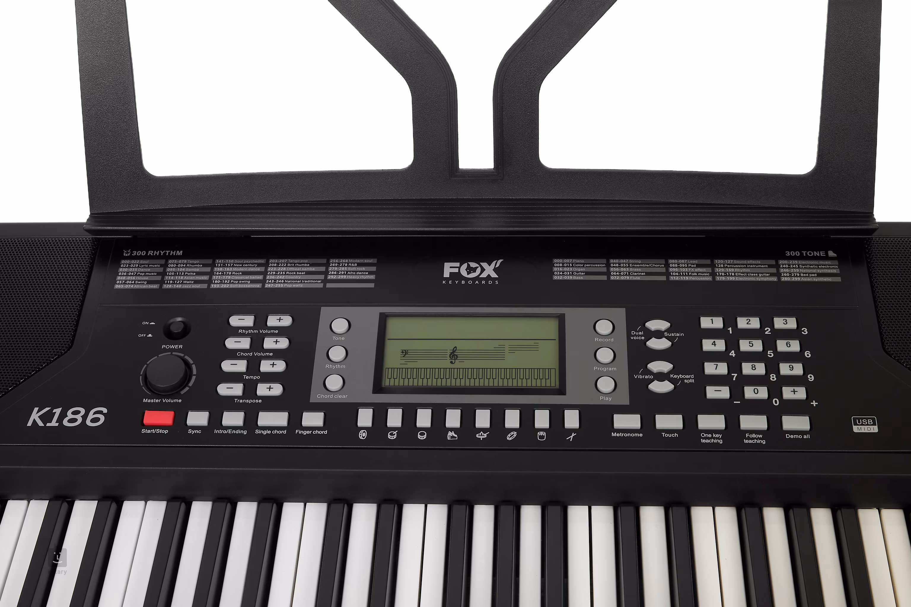 Das FOX K168 bietet 61 Standardtasten mit Dynamik, acht Percussion-Tasten, ein übersichtliches LCD-Display, 300 Sounds, 300 Begleitautomatiken und 40 Demo-Songs. Außerdem gibt es erweiterte Funktionen wie Split (Aufteilung der Tastatur, um zwei Instrumente gleichzeitig zu spielen), Dual Voice (Überlagerung von Klängen) sowie Sustaine (Hall) und Vibrato-Einstellungen. Die Tastatur kann auch transponiert werden, was sowohl Anfänger als auch fortgeschrittene Spieler zu schätzen wissen werden. Natürlich können Sie Akkorde mit einem Finger spielen, mit der Aufnahmefunktion Ihre Versuche aufzeichnen oder das Metronom verwenden. Sie können ein Mikrofon oder ein externes Gerät mit Ihren Lieblingsaufnahmen an die Tasten anschließen und damit jammen. Mit MIDI Out können die Tasten auch als Controller für Musiksoftware verwendet werden.