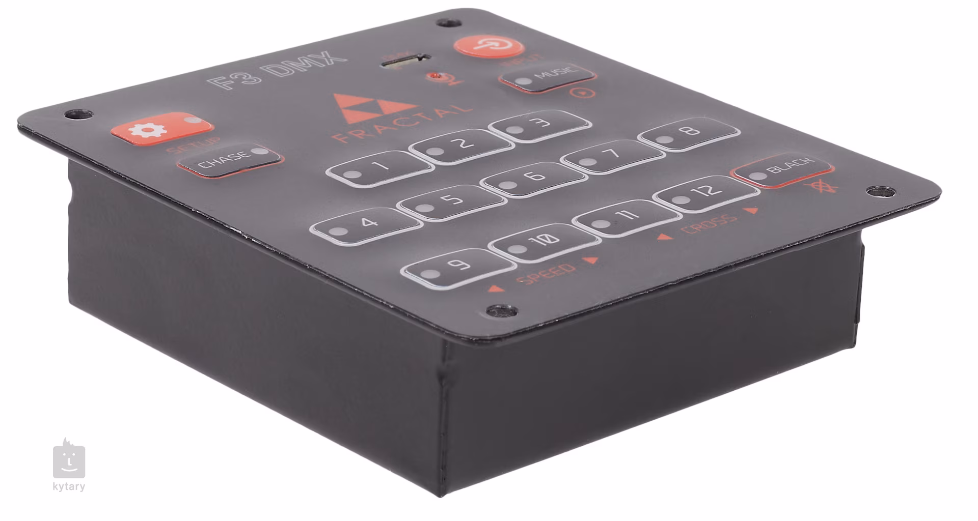 Das F3 DMX Control von Fractal ist eine Ergänzung zum F2 DMX Control. Es ist ein wandmontiertes Panel, mit dem Sie bis zu 12 Geräte mit 16 Kanälen steuern können, was insgesamt 192 DMX-Kanäle ergibt. Darüber hinaus kann es 12 statische Szenen oder eines von 12 Programmen abspielen, die zuvor vom F2-Gerät übertragen wurden. Das Panel bietet somit einen schnellen Zugriff auf die wichtigsten Funktionen. Es ermöglicht auch die Änderung der Übergangszeit (Cross), der Abspielgeschwindigkeit (Speed) und bietet im Falle der Audiosteuerung eine Taste zur Einstellung der Mikrofonempfindlichkeit.