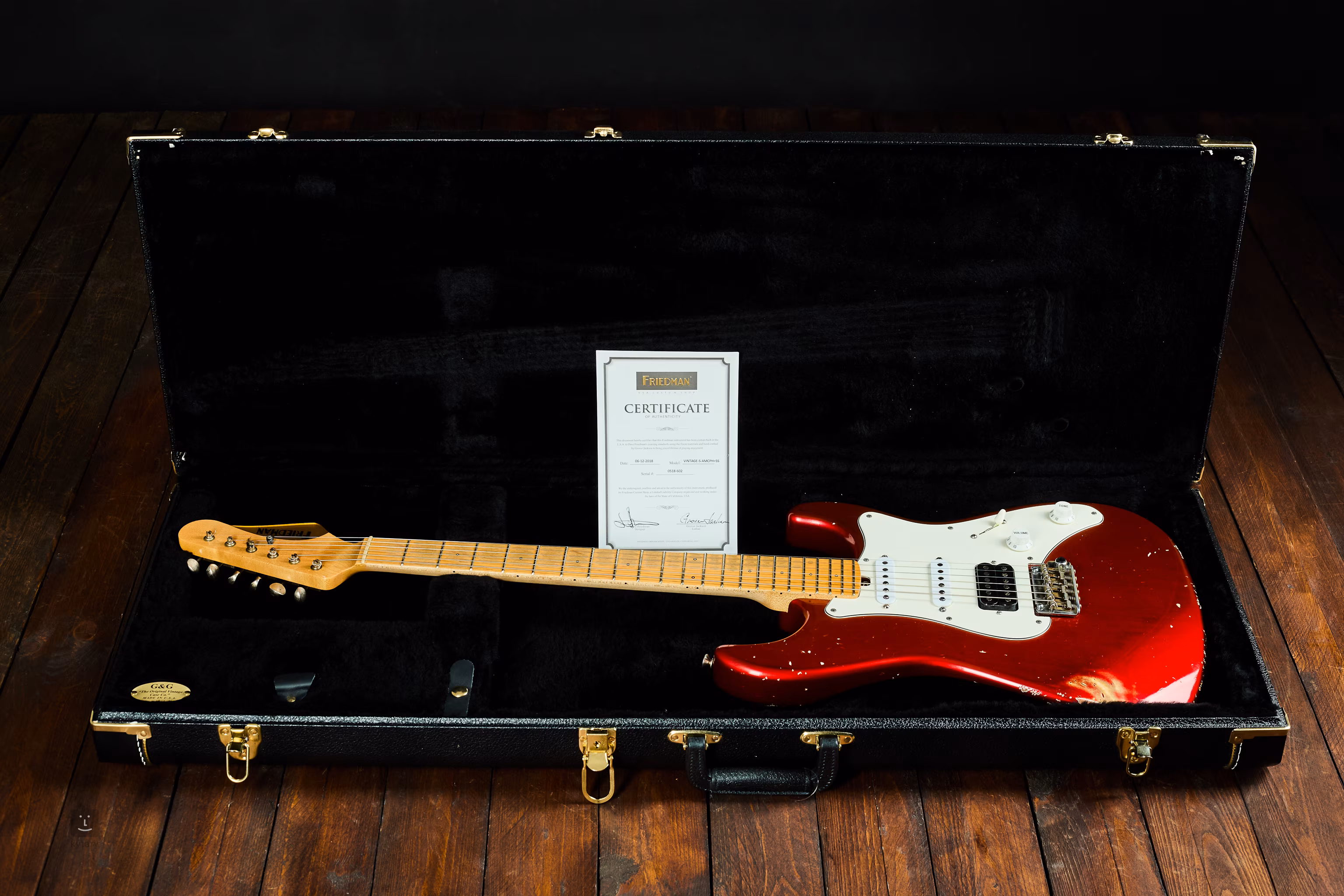 Im Originalkoffer: Friedman CS USA Zertifikat und Original-Tremolohebel. Gebrauchtware im BAZAR-/Differenzbesteuerungsmodus.