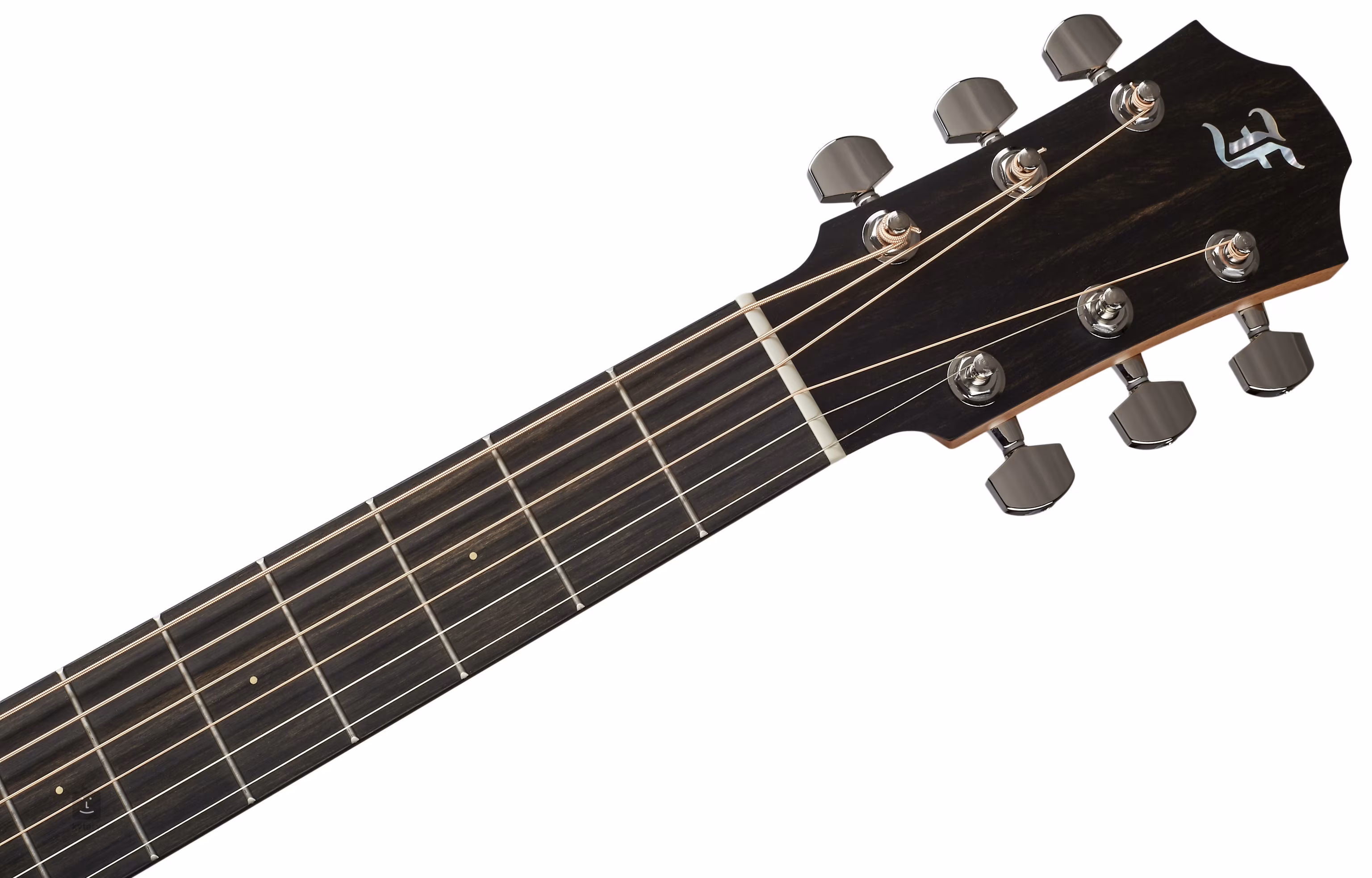 Die Orientierung auf dem Ebenholzgriffbrett wird durch seitliche und vordere Positionsmarkierungen erleichtert. Die Bünde mit verkürzten Füßen reichen bewusst nicht bis zu den Rändern des Griffbretts - das verhindert ihr Aufsteigen durch das Zusammensacken des Griffbretts bei niedriger Luftfeuchtigkeit. Die präzise und stabile Stimmung wird durch die verchromte Mechanik des Unternehmens mit einer Übersetzung von 1:18 garantiert.