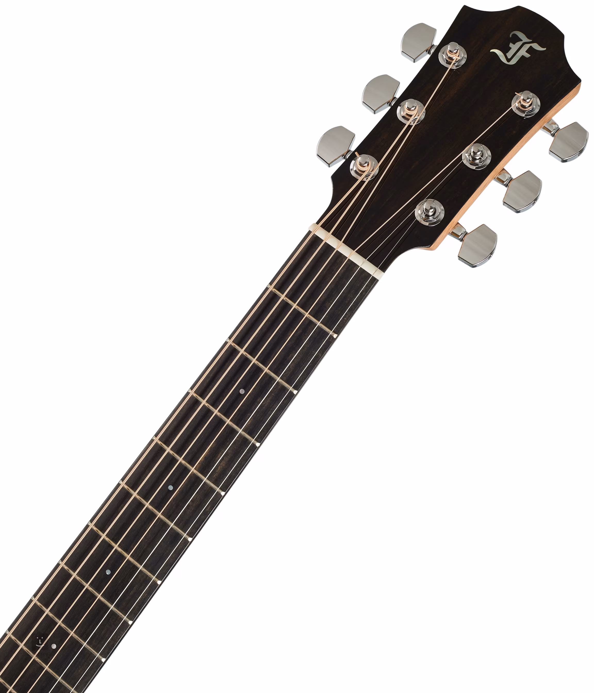 Die Orientierung auf dem Ebenholzgriffbrett wird durch seitliche und vordere Positionsmarkierungen aus weißem Perlmutt erleichtert. Die verchromten Werksmechaniken mit einer Übersetzung von 1:18 garantieren eine präzise und stabile Stimmung. Das luxuriöse Aussehen der Furch Green Gitarren wird durch das elfenbeinfarbene Imitationsbinding mit fünf Lagen schwarzer und weißer Kontrastlinien und einer Rosette aus einem Doppelring mit Nussbaumeinlage unterstrichen.