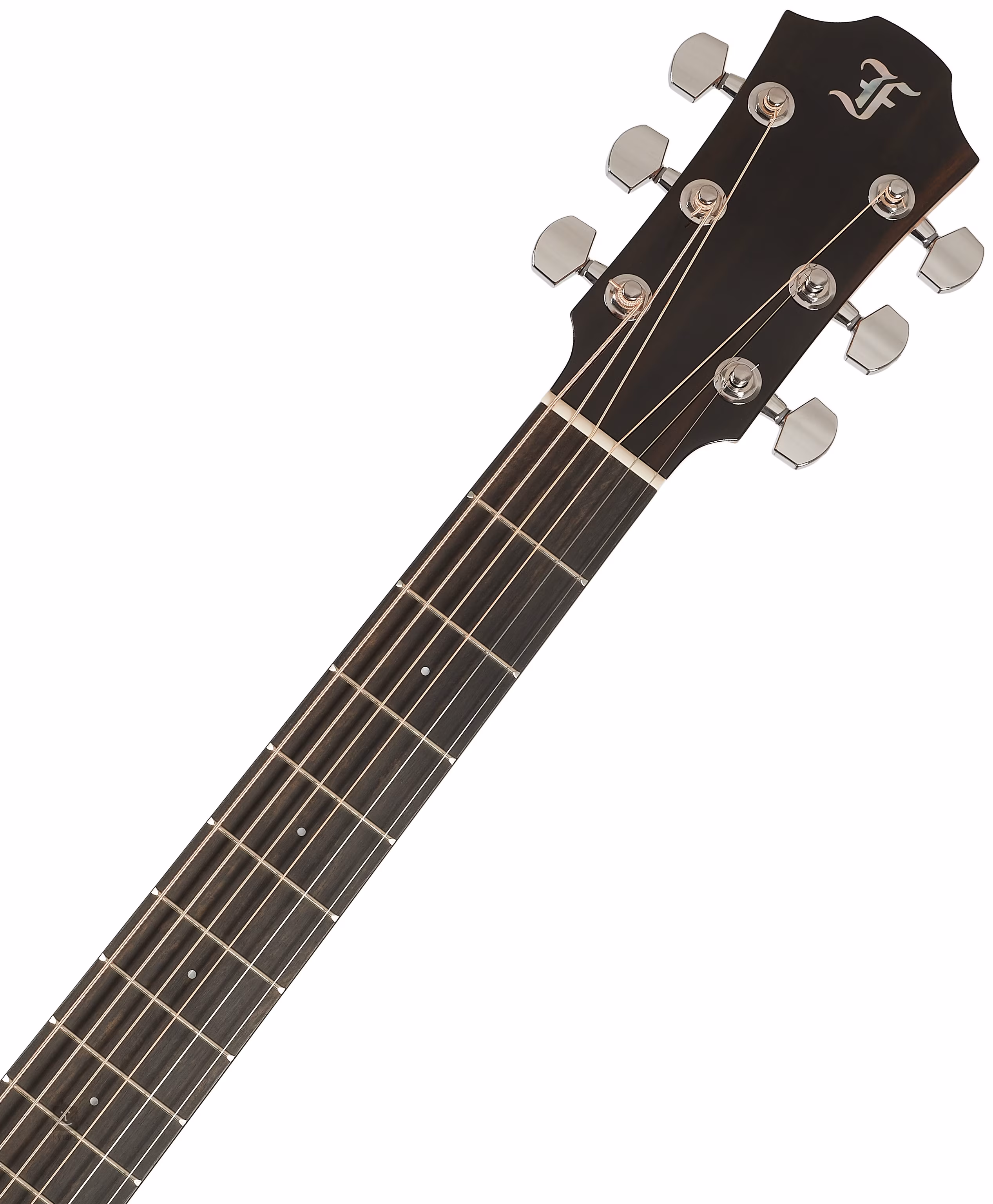 Die Orientierung auf dem Ebenholz-Griffbrett wird durch vordere und seitliche Perlmutt-Punktmarkierungen erleichtert. Das transparente Schlagbrett lässt die natürliche Maserung des Holzes zur Geltung kommen, ohne die Resonanz des Resonanzbodens zu beeinträchtigen. Die präzise und stabile Stimmung wird durch verchromte Mechaniken mit einem Übersetzungsverhältnis von 1:18 gewährleistet. Die schöne Verarbeitung wird durch ein Binding aus Elfenbeinimitat mit fünf Lagen schwarzer und weißer Kontrastlinien und eine Rosette aus einem Doppelring mit Walnuss-Intarsien akzentuiert.
