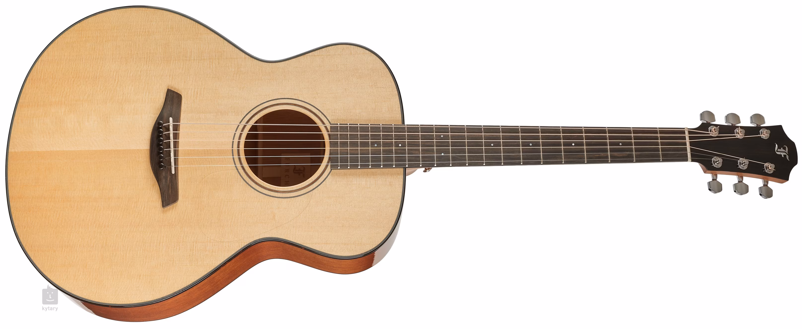 Die Orientierung auf dem Ebenholzgriffbrett wird durch vordere und seitliche Perlmutt-Punktmarkierungen erleichtert. Das transparente Schlagbrett bringt die natürliche Maserung des Holzes zur Geltung und beeinträchtigt gleichzeitig nicht die Resonanz der Decke. Präzises und stabiles Stimmen garantieren die verchromten Mechaniken des Herstellers mit einem Übersetzungsverhältnis von 1:18. Die schöne Verarbeitung wird durch eine Einlage aus Imitations-Schildpatt mit einem Fünf-Schichten-Inlay aus kontrastierenden schwarzen und weißen Linien und einer Rosette aus einem doppelten Ring mit Walnuss-Intarsien unterstrichen.