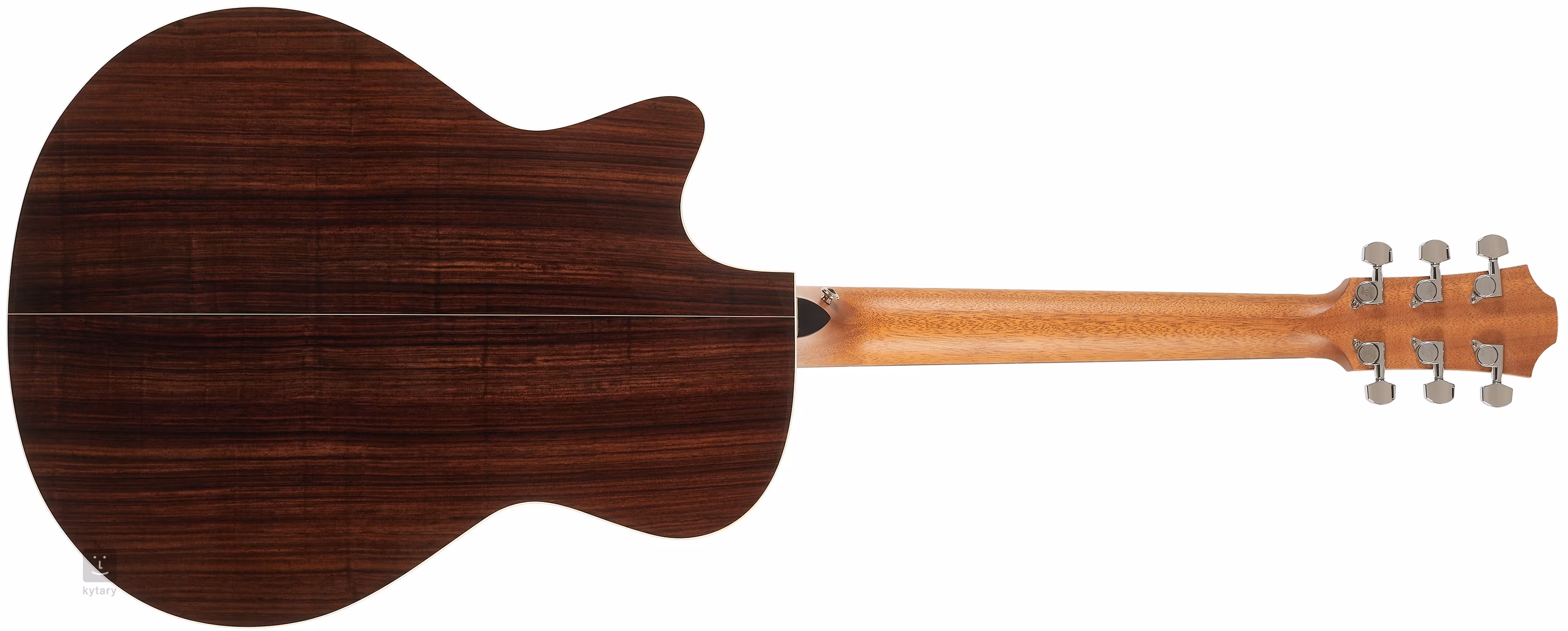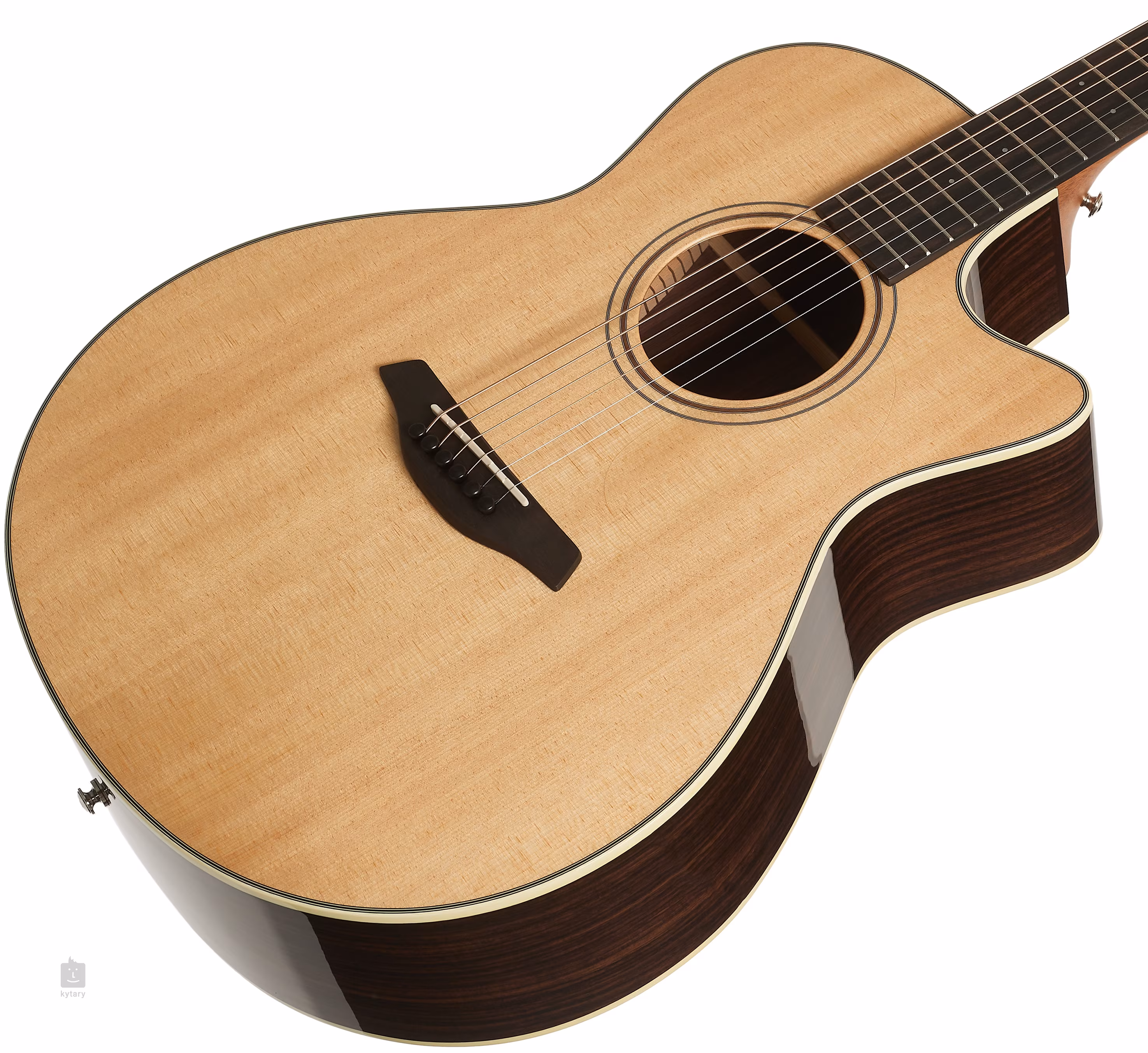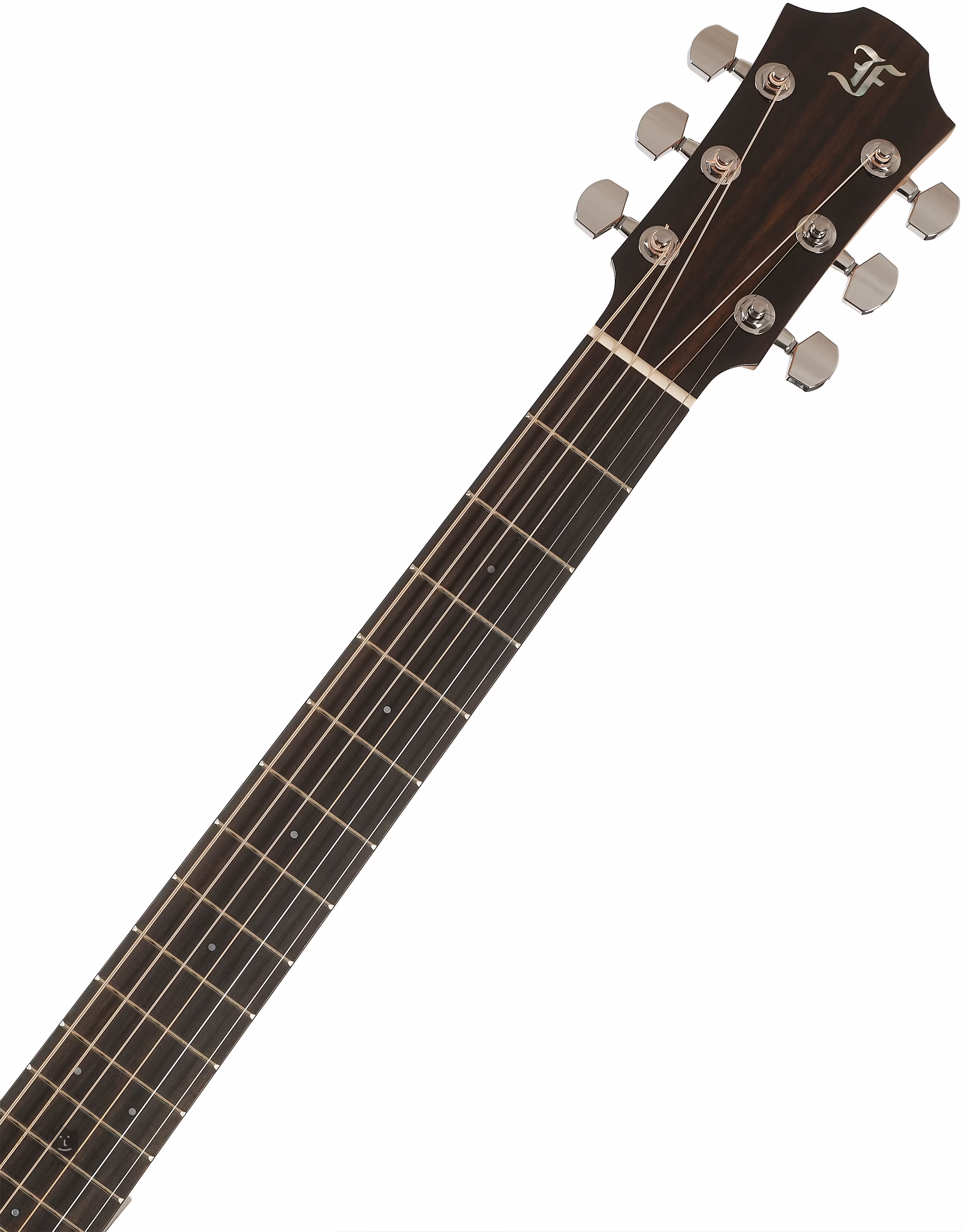 Die Orientierung auf dem Ebenholzgriffbrett wird durch vordere und seitliche Perlmutt-Punktmarkierungen erleichtert. Das transparente Schlagbrett bringt die natürliche Maserung des Holzes zur Geltung und beeinträchtigt gleichzeitig nicht die Resonanz der Decke. Präzises und stabiles Stimmen garantieren die verchromten Mechaniken des Herstellers mit einem Übersetzungsverhältnis von 1:18. Die schöne Verarbeitung wird durch eine Einlage aus Imitationselfenbein mit fünf kontrastierenden schwarzen und weißen Linien und einer Rosette aus einem doppelten Ring mit Walnuss-Intarsien unterstrichen.