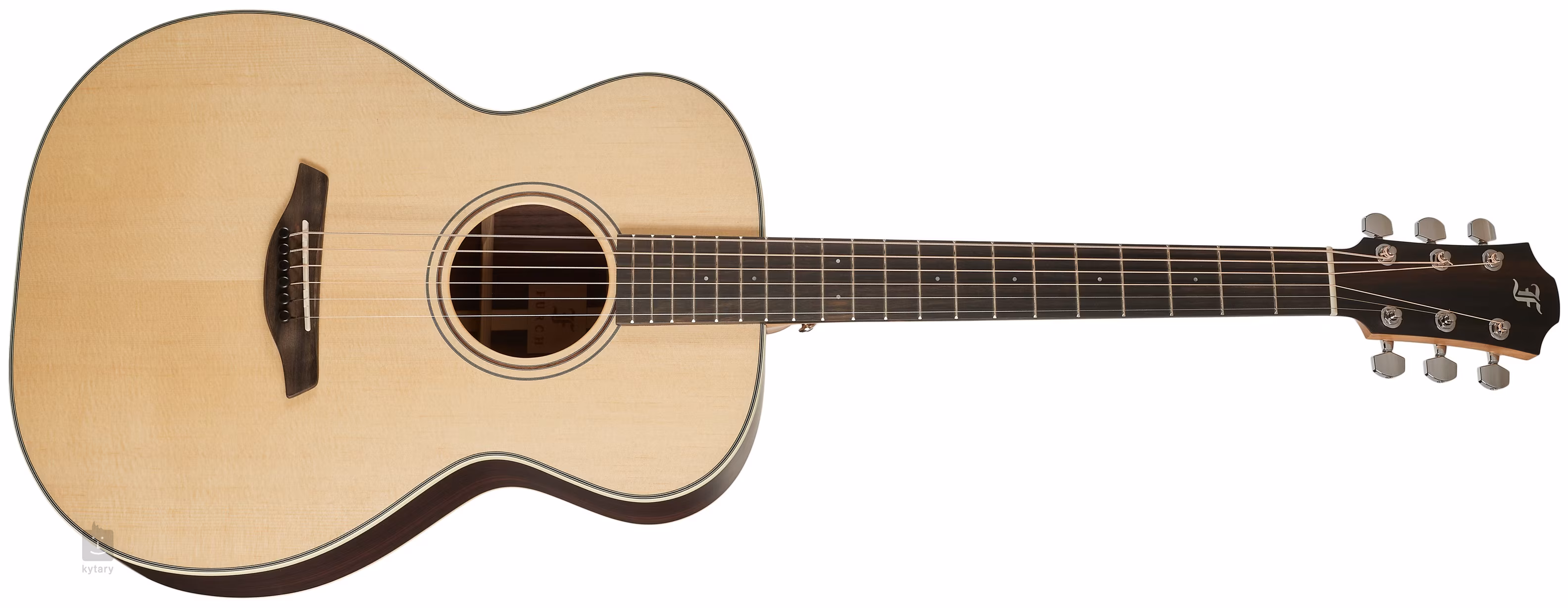 Die Orientierung auf dem Ebenholzgriffbrett wird durch vordere und seitliche Perlmutt-Punktmarkierungen erleichtert. Das transparente Schlagbrett bringt die natürliche Maserung des Holzes zur Geltung und beeinträchtigt gleichzeitig nicht die Resonanz der Decke. Präzises und stabiles Stimmen garantieren die verchromten Mechaniken des Herstellers mit einem Übersetzungsverhältnis von 1:18. Die schöne Verarbeitung wird durch eine Einlage aus Elfenbeinimitat mit fünf kontrastierenden schwarzen und weißen Linien und einer Rosette aus einem doppelten Ring mit Walnuss-Intarsien unterstrichen.