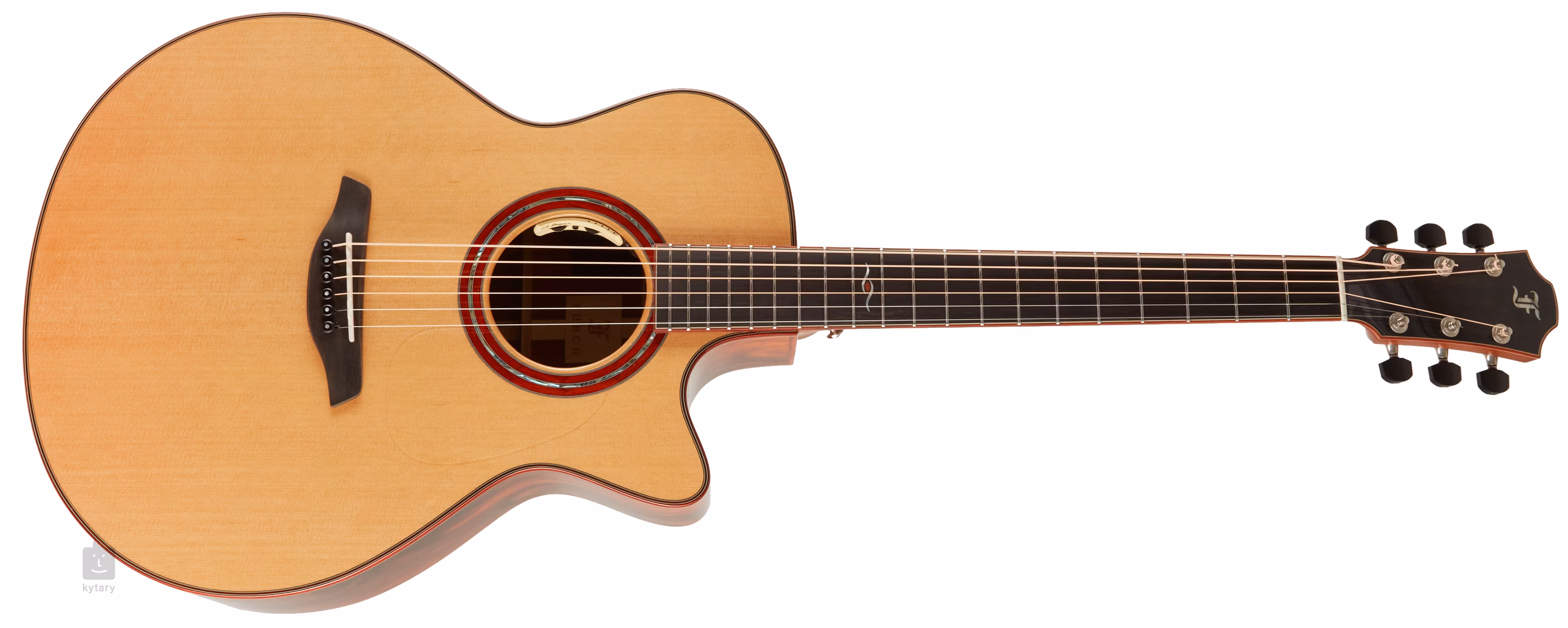 Das edle Erscheinungsbild der Gitarre wird durch dekorative Elemente aus amerikanischem Redheart-Holz unterstrichen - Korpus, Griffbrett und Kopfplatteneinfassung mit weißen Kontrastlinien, massive Redheart- und Perlmuttrosette (Abalone), Frontplattenverzierung mit schwarzen und weißen Linien, Mittelstreifen mit weißen Kontrastlinien auf beiden Seiten und Endblockverzierung. Das transparente Schlagbrett lässt die natürliche Maserung des Holzes zur Geltung kommen, ohne die Resonanz des Resonanzbodens zu beeinträchtigen. Die Orientierung auf dem Ebenholzgriffbrett wird durch dekorative Perlmutt-Positionsmarkierungen erleichtert. Für eine stabile Stimmung sorgen hochwertige Gotoh 510 Nickel-Patina-Mechaniken mit Ebenholzwirbeln.