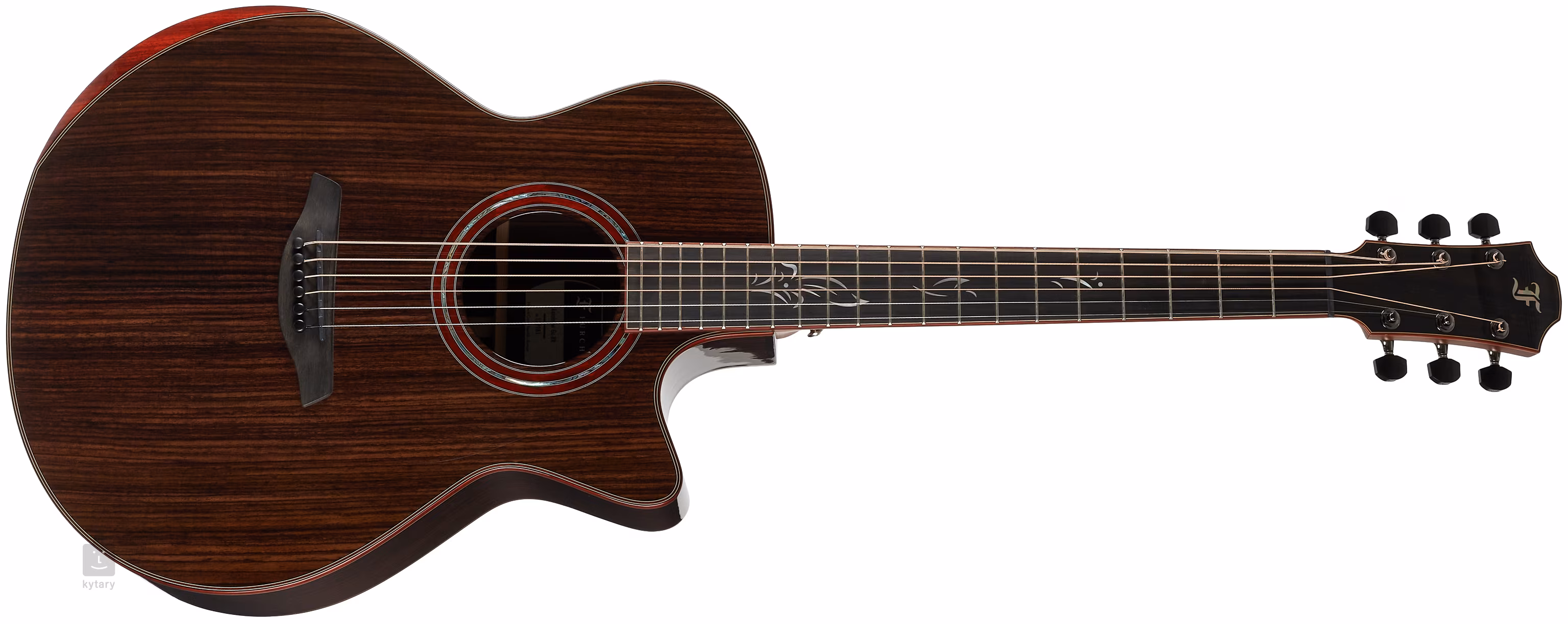 Das Griffbrett und die Kopfplatte sind aus Ebenholz gefertigt. Die Oberfläche des Griffbretts ist mit dekorativen weißen Perlmuttblättern verziert. Das edle Erscheinungsbild der Gitarre wird durch die Korpus-, Griffbrett- und Kopfplatteneinfassung aus rotem Hartholz mit weißen Kontrastlinien, die Fronteinlage aus rotem Hartholz mit schwarzen und weißen Linien, die Rosette aus massivem rotem Hartholz und Perlmutt (Abalone) und die Einlage in der Mitte der Rückwand aus rotem Hartholz unterstrichen. Eine stabile Stimmung wird durch hochwertige Gotoh 510 Cosmo Black Mechaniken mit Ebenholzwirbeln garantiert.