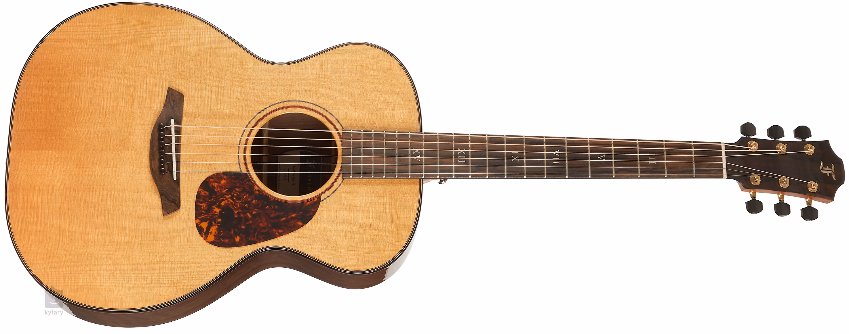 Das Griffbrett und die Kopfplatte sind aus Ziricote gefertigt. Die Oberfläche des Griffbretts ist mit Perlmutt-Positionsmarkierungen verziert. Das edle Aussehen der Gitarre wird durch die Korpuseinfassung aus Perlmuttimitat, die Deckeneinlage aus Redheart mit schwarzen und weißen Linien, die Doppelring-Rosette mit Redheart-Einlage, das Ziricote-Furnier auf der Kopfplatte, das Schlagbrett aus Schildpattimitat und die Ebenholzwirbel im Griffbrett unterstrichen. Eine stabile Stimmung wird durch das hochwertige Gotoh 510 Gold Patina-Werk mit Ebenholzwirbeln garantiert.
