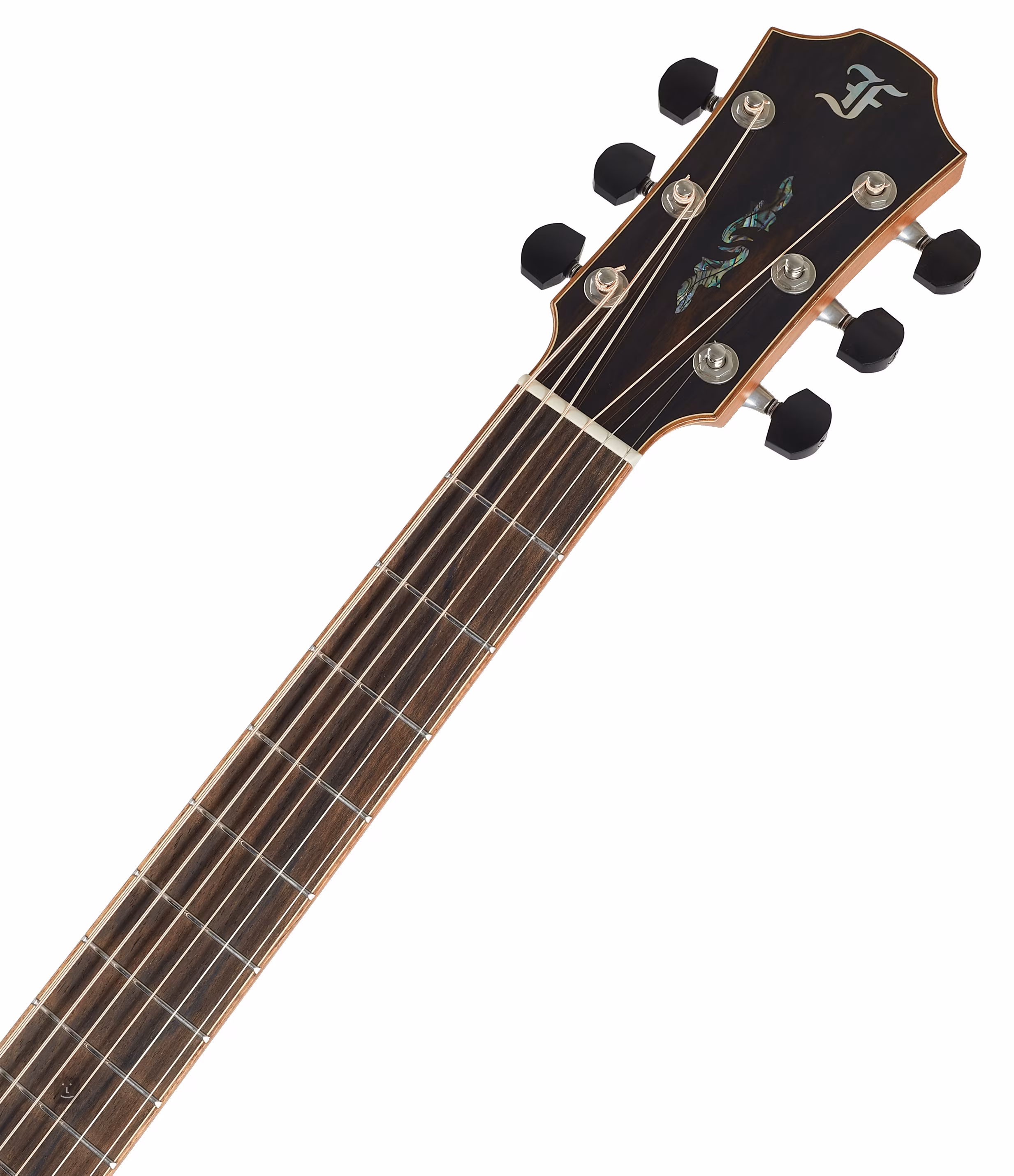 Das Griffbrett aus exklusivem mittelamerikanischem Ziricote-Holz mit markanter Maserung ist mit perlmuttfarbenen Einlagen in Form von Blättern verziert, ein ähnliches natürliches Muster aus grünem Abalone findet sich auf dem Kopf der Gitarre. Das transparente Schlagbrett bringt die natürliche Maserung des Holzes zur Geltung und beeinträchtigt gleichzeitig nicht die Resonanz der Decke. Die hochwertigen Gotoh 510-Mechaniken in Silberpatina mit polierten Ebenholzknöpfen und einem Übersetzungsverhältnis von 1:21 sorgen für eine stabile Stimmung. Das luxuriöse Aussehen der Gitarre wird durch den Steg und das Kopfplättchen aus Ziricote-Holz, die Einfassung des Korpus, des Griffbretts und des Kopfes sowie die Verzierung des Endblocks aus hawaiianischem Koa, die Perlmutt-Einlage der Decke (Abalone) und die hochwertige Ringrosette aus hawaiianischem Koa und Perlmutt (Abalone) unterstrichen.