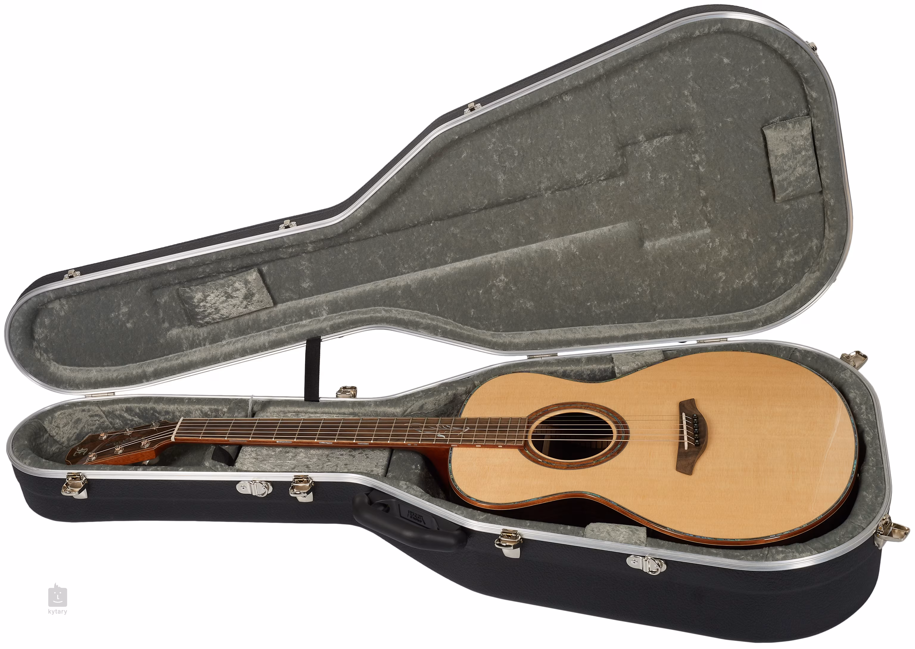 Das Griffbrett aus exklusivem mittelamerikanischem Ziricote-Holz mit markanter Maserung ist mit perlmuttfarbenen Einlagen in Form von Blättern verziert, ein ähnliches natürliches Muster aus grünem Abalone findet sich auf dem Kopf der Gitarre. Das transparente Schlagbrett bringt die natürliche Maserung des Holzes zur Geltung und beeinträchtigt gleichzeitig nicht die Resonanz der Decke. Die hochwertigen Gotoh 510-Mechaniken in Silberpatina mit polierten Ebenholzknöpfen und einem Übersetzungsverhältnis von 1:21 sorgen für eine stabile Stimmung. Das luxuriöse Aussehen der Gitarre wird durch den Steg und das Kopfplättchen aus Ziricote-Holz, die Einfassung des Korpus, des Griffbretts und des Kopfes sowie die Verzierung des Endblocks aus hawaiianischem Koa, die Perlmutt-Einlage der Decke (Abalone) und die hochwertige Ringrosette aus hawaiianischem Koa und Perlmutt (Abalone) unterstrichen.