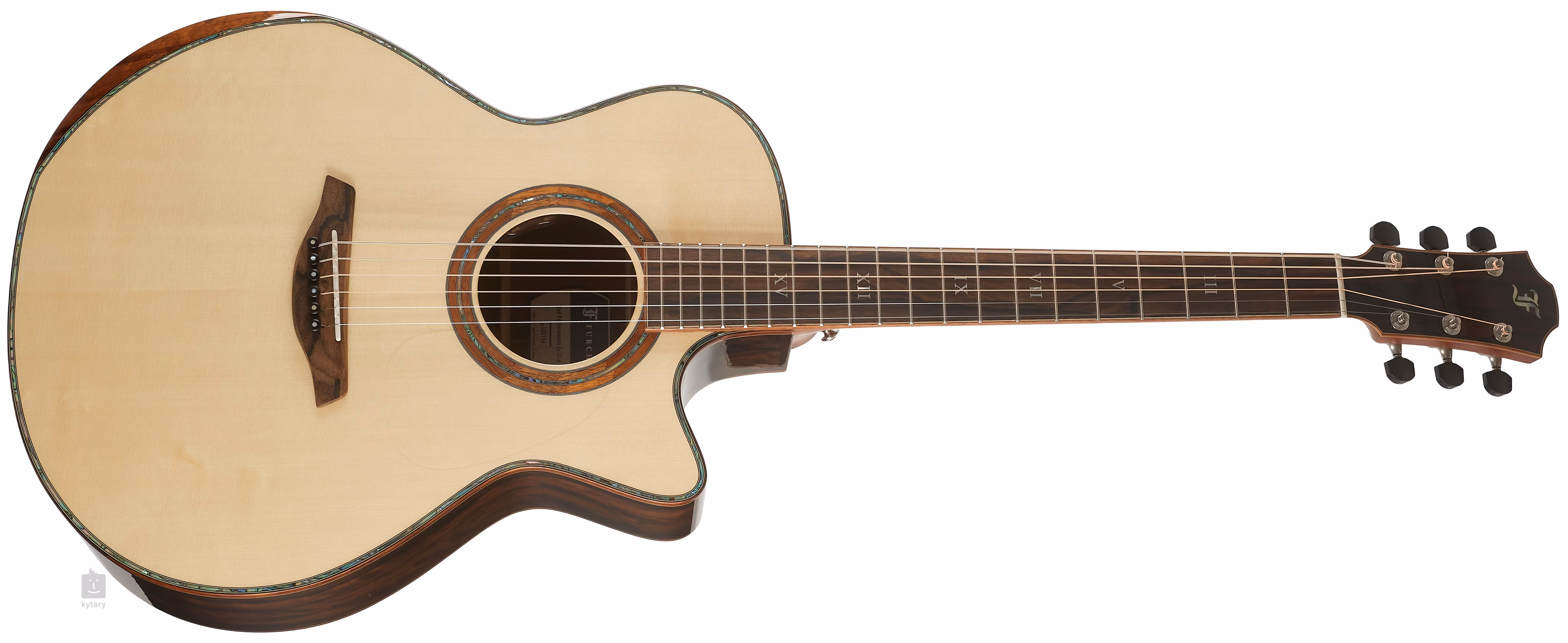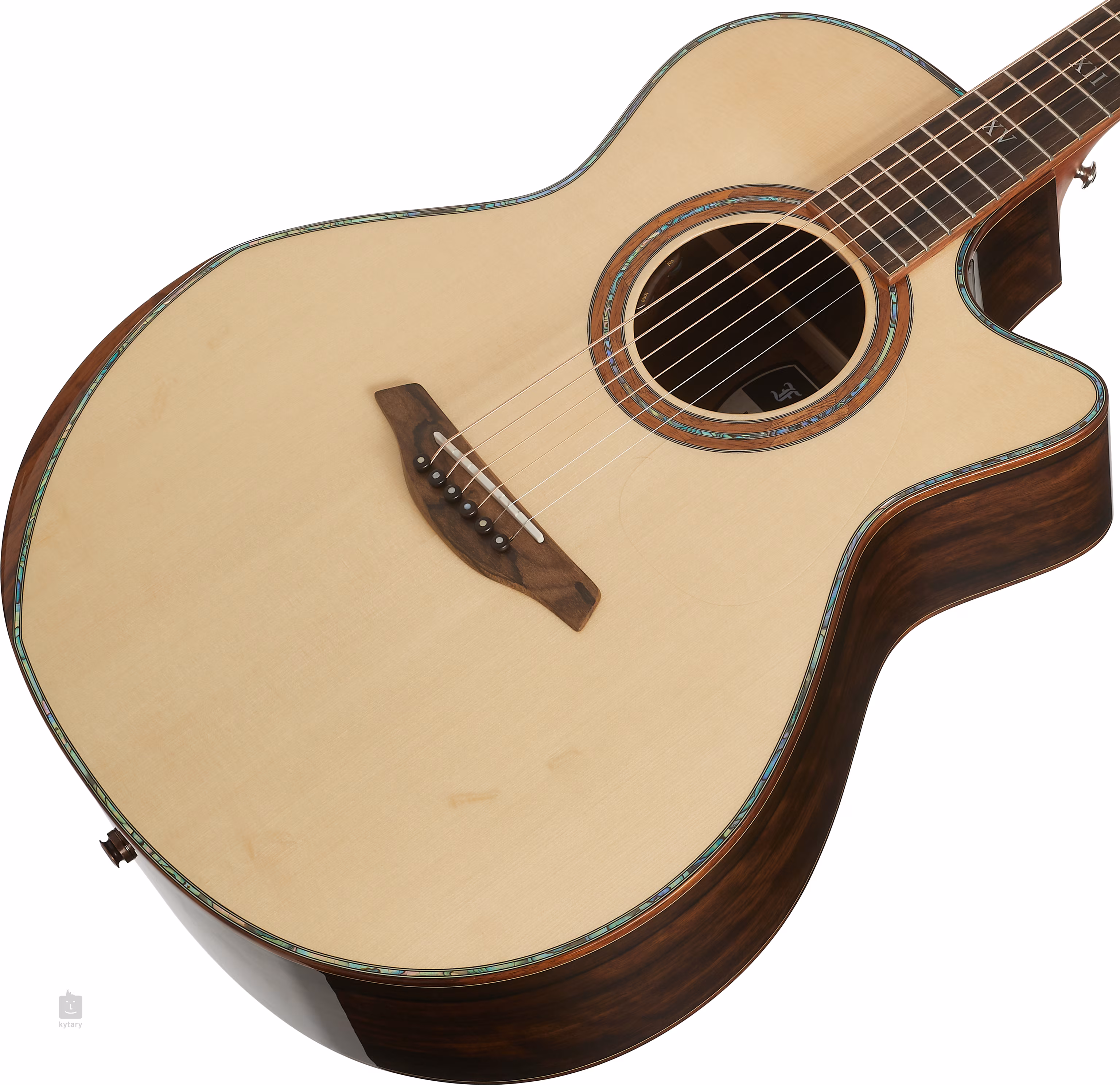 Das Griffbrett aus exklusivem mittelamerikanischem Ziricote-Holz mit markanter Maserung ist mit Perlmutt-Positionsmarkierungen verziert. Das transparente Schlagbrett bringt die natürliche Maserung des Holzes zur Geltung und beeinträchtigt gleichzeitig nicht die Resonanz der Decke. Die hochwertigen Gotoh 510-Mechaniken in Silberpatina mit polierten Ebenholzknöpfen und einem Übersetzungsverhältnis von 1:21 sorgen für eine stabile Stimmung. Das luxuriöse Aussehen der Gitarre wird durch den Steg und die Kopfplatte aus Ziricote-Holz, die Einfassung des Korpus, des Griffbretts und der Kopfplatte sowie die Verzierung des Endblocks aus hawaiianischem Koa, die Perlmutt-Einlage der Decke (Abalone) und die hochwertige Ringrosette aus hawaiianischem Koa und Perlmutt (Abalone) unterstrichen.