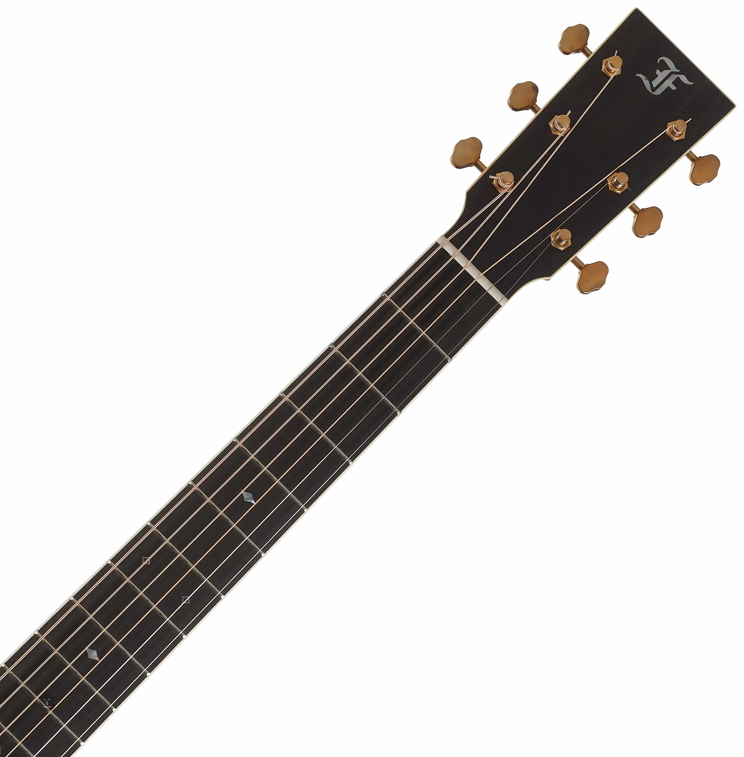 Die Orientierung auf dem Ebenholzgriffbrett erleichtern quadratische Positionsmarkierungen aus weißem Perlmutt und seitliche schwarze Punktmarkierungen. Eine stabile Stimmung garantieren die hochwertigen Gotoh SE700-Mechaniken in Goldpatina mit einer Übersetzung von 1:15. Der Vintage-Look der Gitarre wird durch die Einlage der Decke mit Fischgrätenmotiv, die doppelte Ringrosette aus grünem Abalone, die Einfassung des Korpus, des Kopfes und des Griffbretts aus Kunstelfenbein und das Schlagbrett aus Schildpattimitat unterstrichen.