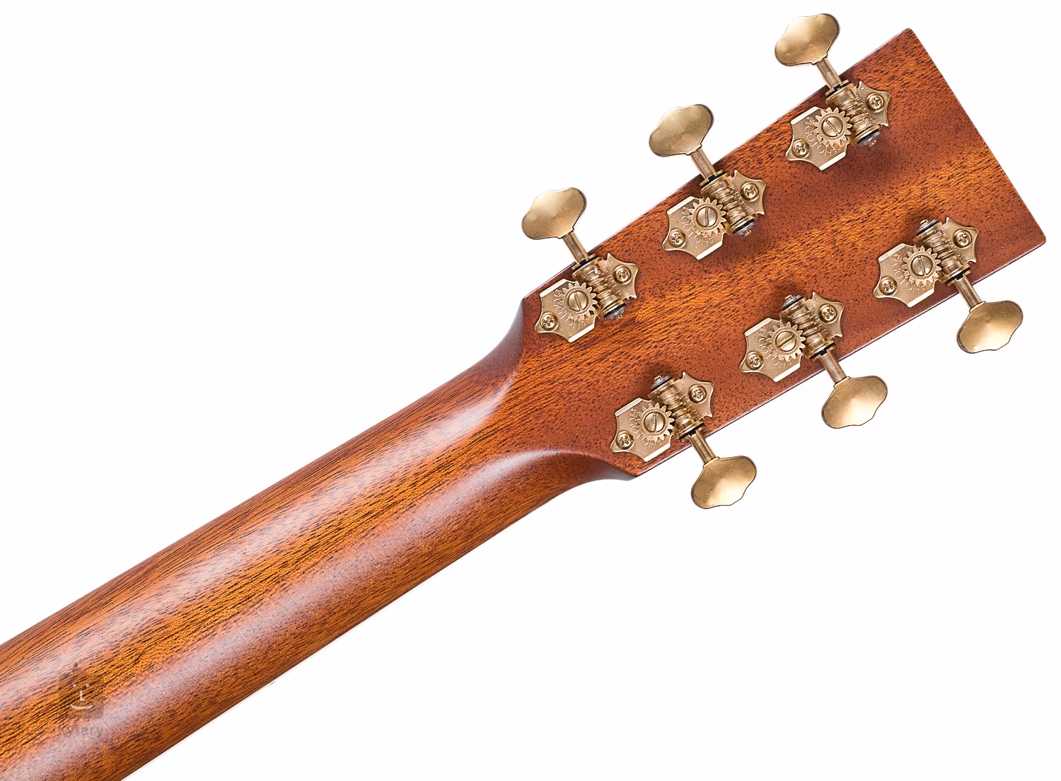 Die Orientierung auf dem Ebenholzgriffbrett erleichtern quadratische Positionsmarkierungen aus weißem Perlmutt und seitliche schwarze Punktmarkierungen. Eine stabile Stimmung garantieren die hochwertigen Gotoh SE700-Mechaniken in Goldpatina mit einem Übersetzungsverhältnis von 1:15. Der Vintage-Look der Gitarre wird durch die Einlage der Decke mit Fischgrätenmotiv, die doppelte Ringrosette aus grünem Abalone, die Einfassung des Korpus, des Kopfes und des Griffbretts aus Kunstelfenbein und das Schlagbrett aus Schildpattimitat unterstrichen.