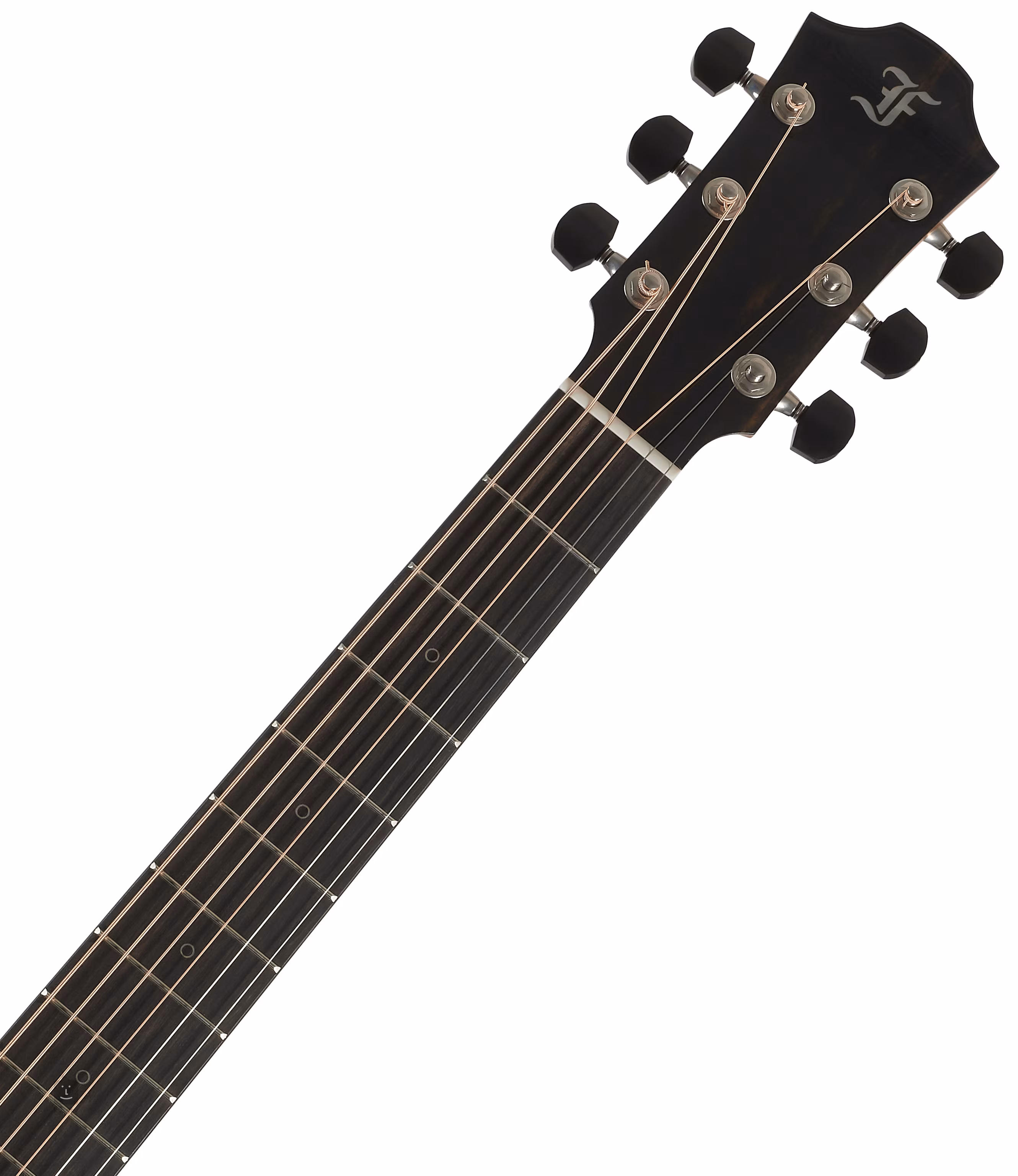 Das attraktive Aussehen der Gitarre wird durch eine Reihe von Details unterstrichen: eine Rosette, die aus einem mit grünem Abalone eingelegten Doppelring besteht, ein Schlagbrett aus fünf Lagen schwarzer und weißer Kontrastlinien sowie seitliche lineare und vordere runde Positionsmarkierungen aus Perlmutt. Das transparente Schlagbrett lässt die natürliche Maserung des Holzes zur Geltung kommen, ohne die Resonanz des Resonanzbodens zu beeinträchtigen. Für eine stabile Stimmung sorgt die hochwertige Gotoh 510 Mechanik in Silberpatina mit Ebenholzwirbeln und feiner 1:21-Übersetzung.