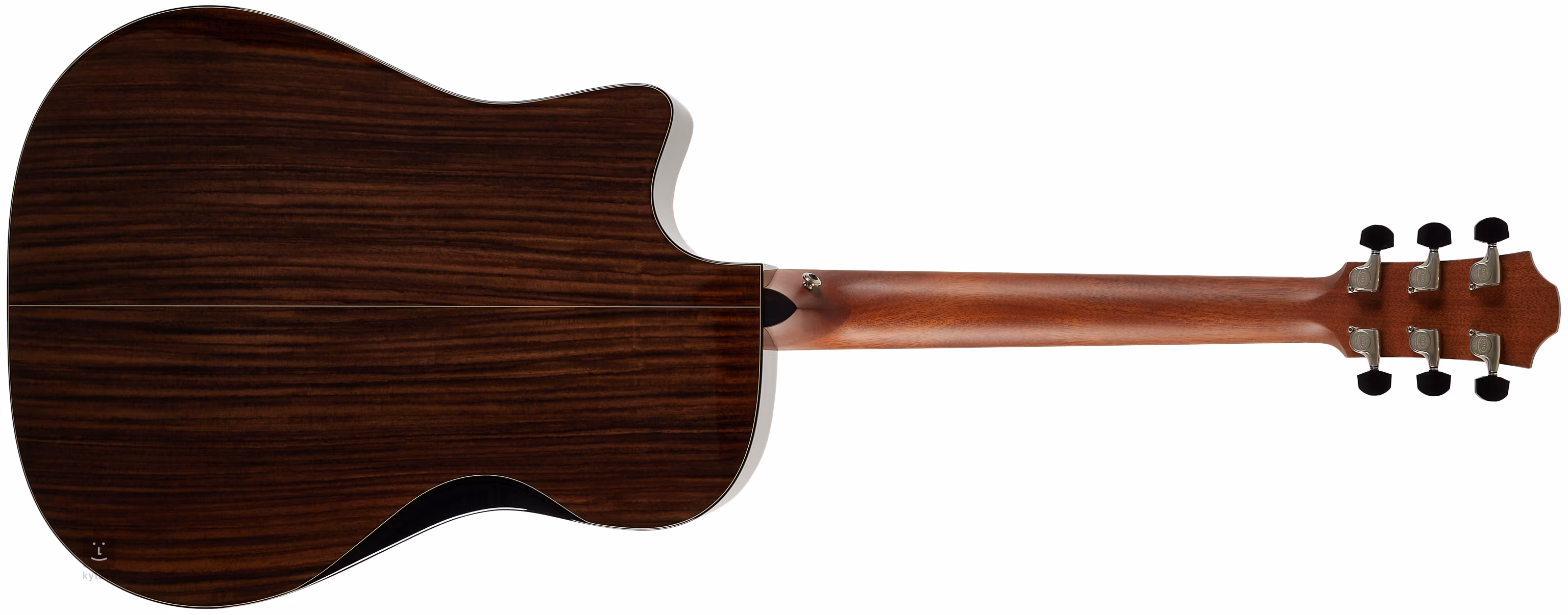 Das attraktive Erscheinungsbild der Gitarre wird durch eine Reihe von Details unterstrichen: eine Rosette, die aus einem mit grünem Abalone eingelegten Doppelring besteht, ein Schlagbrett aus fünf Schichten schwarzer und weißer Kontrastlinien sowie seitliche lineare und vordere runde Positionsmarkierungen aus Perlmutt. Das transparente Schlagbrett lässt die natürliche Maserung des Holzes zur Geltung kommen, ohne die Resonanz des Resonanzbodens zu beeinträchtigen. Für eine stabile Stimmung sorgt die hochwertige Gotoh 510 Mechanik in Silberpatina mit Ebenholzwirbeln und feiner 1:21-Übersetzung.