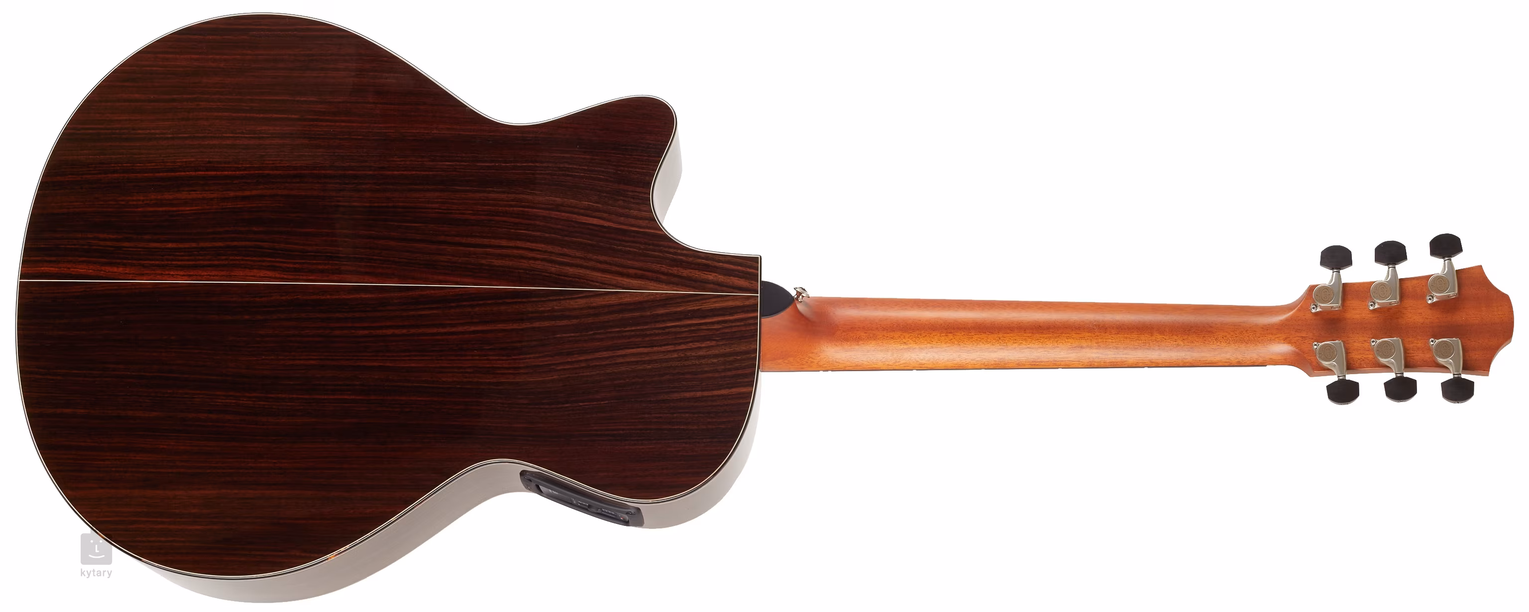 Die Orientierung auf dem Ebenholzgriffbrett wird durch elegante, runde Positionsmarkierungen mit einer dünnen Konturlinie aus weißem Perlmutt und seitlichen Perlmutt-Punktmarkierungen erleichtert. Das transparente Schlagbrett bringt die natürliche Maserung des Holzes zur Geltung und beeinträchtigt gleichzeitig nicht die Resonanz der Decke. Die hochwertigen Gotoh 510-Mechaniken in Silberpatina mit polierten Ebenholzknöpfen und einem sehr feinen Übersetzungsverhältnis von 1:21 sorgen für eine stabile Stimmung. Die schöne Verarbeitung wird durch feine Details wie die Einfassung des Korpus aus Kunstschildpatt und die doppelte Ringrosette mit einem Einsatz aus grünem Abalone mit schwarz-weißer Linie unterstrichen.