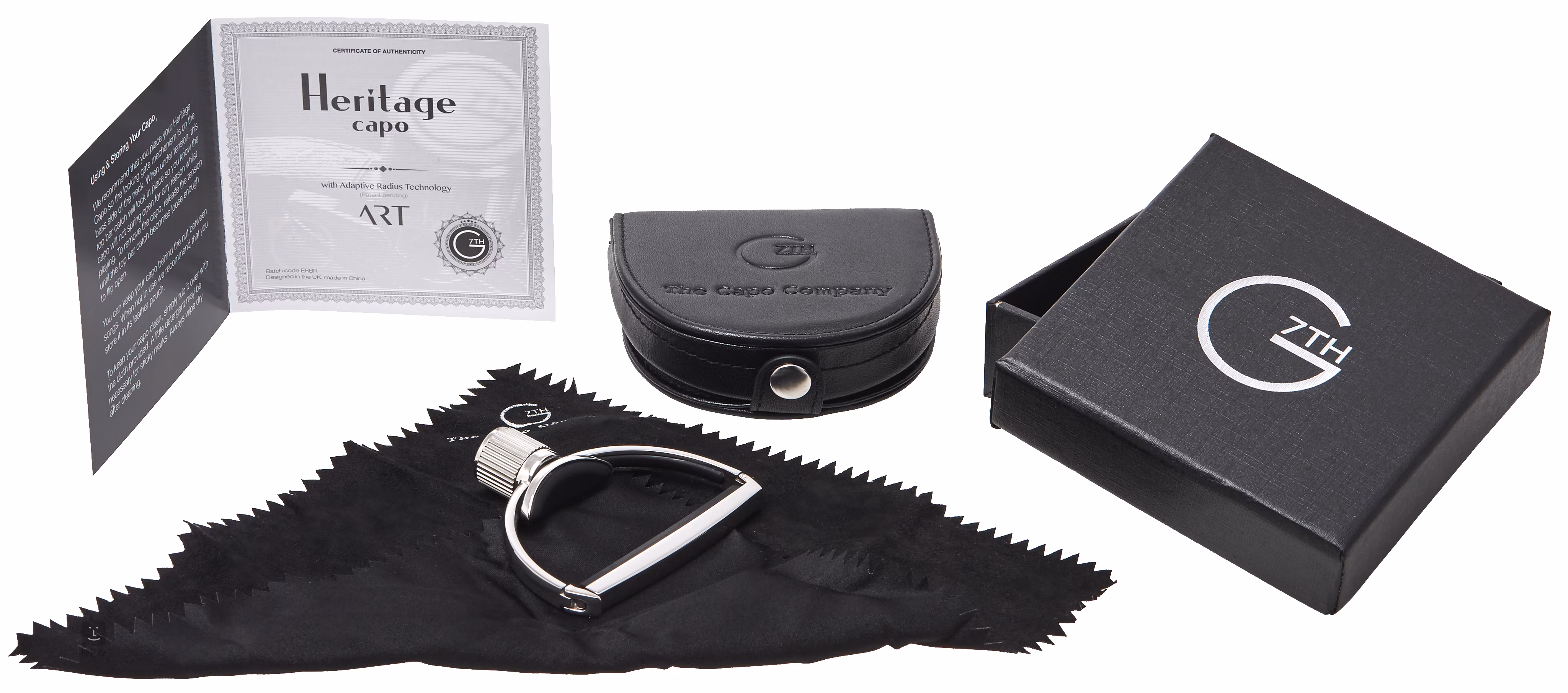 Heritage Capodasters verbinden Tradition mit innovativen Ansätzen. Ihre handpolierte Edelstahlkonstruktion ist mit der A.R.T.-Technologie (Adaptive Radius Technology) ausgestattet, mit der sich die Kapodaster an Instrumente mit beliebiger Halsdicke und beliebigem Profil anpassen lassen. Die Teile, die mit dem Gitarrenhals in Berührung kommen, sind mit einem gummierten Silikoneinsatz versehen, um Beschädigungen zu vermeiden. Das Ergebnis ist immer ein klarer, warmer Ton ohne unerwünschte Geräusche und eine stabile Stimmung. Im Lieferumfang enthalten sind ein Lederetui, ein Reinigungstuch und eine Geschenkbox.