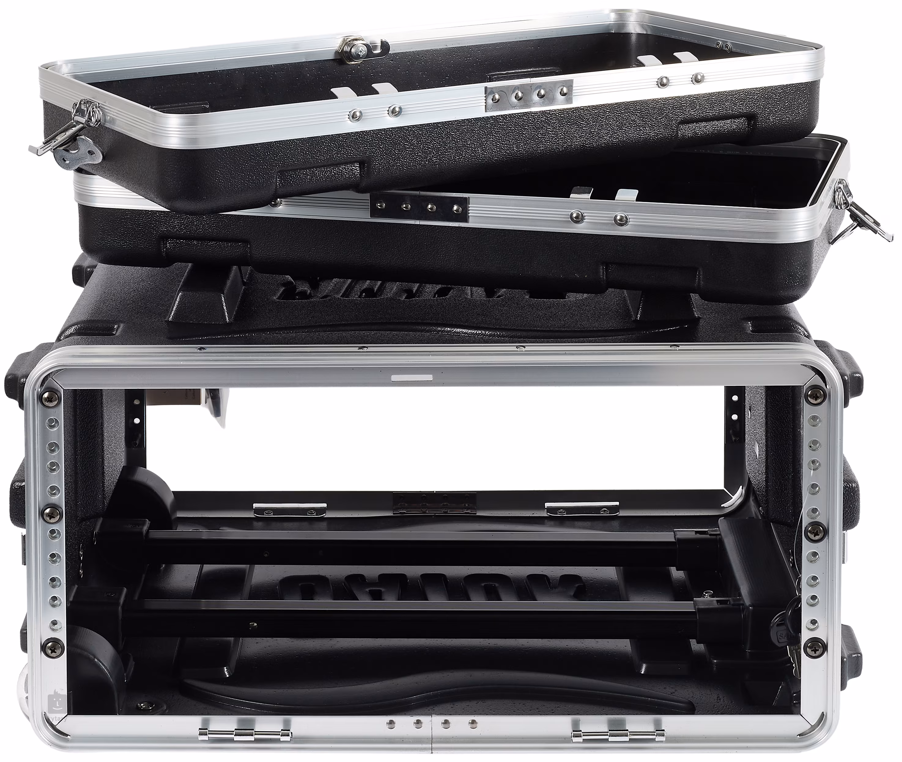 Im Inneren des Koffers befinden sich 7-mm-Rackschienen aus verzinktem Stahl. Im Lieferumfang ist ein Satz Schrauben enthalten, der für die Installation Ihrer gesamten Ausrüstung ausreicht. Das Rack hat eine Standard 19" Größe und bietet Platz für vier Geräte (4U).