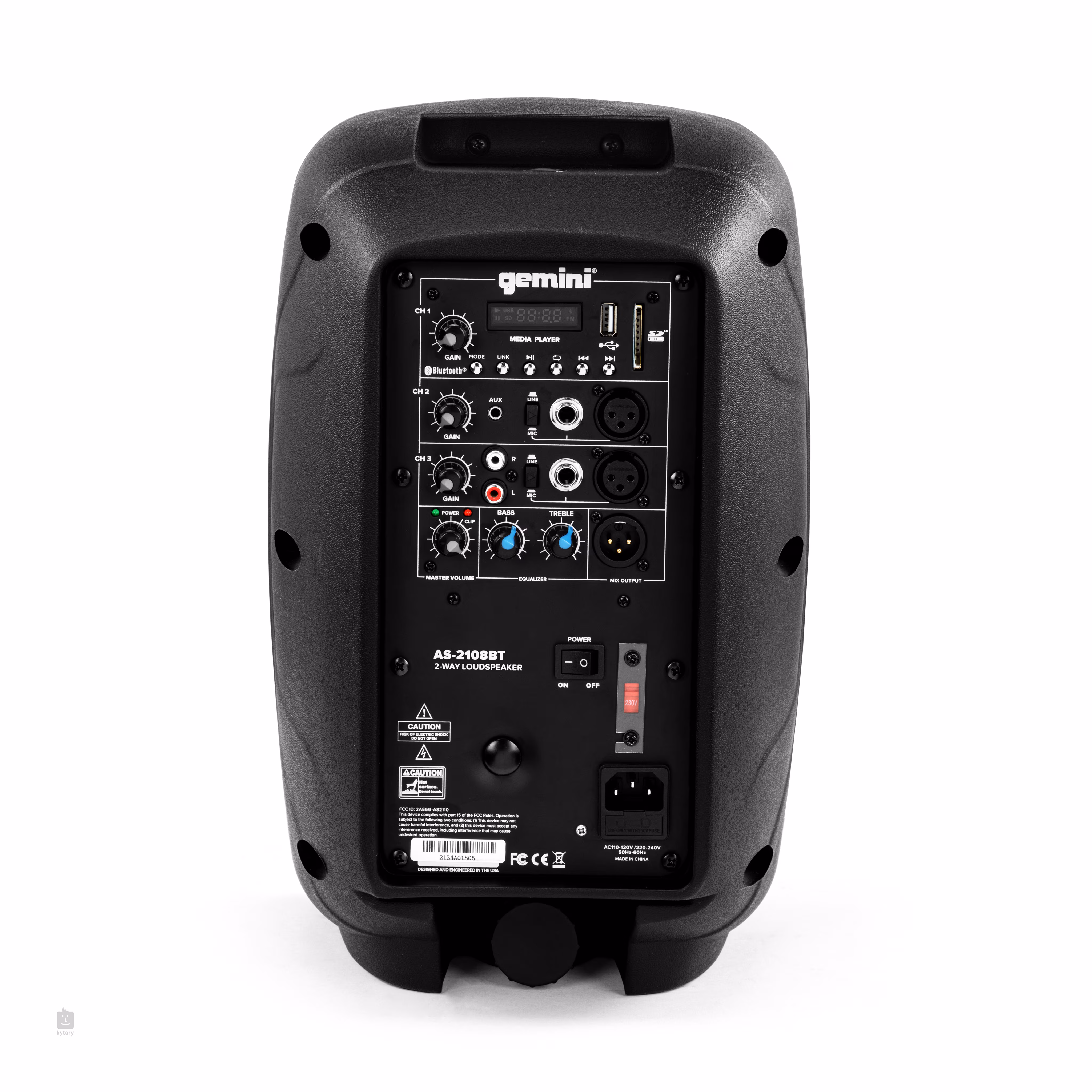 Der Lautsprecher verfügt über drei Kanäle. Der erste ist mit einem hochwertigen externen Audioplayer ausgestattet, den Sie über USB, SD-Karte oder Bluetooth anschließen können. Außerdem gibt es einen integrierten FM-Player für den Empfang von Radiowellen. An die Kanäle 2 und 3 können Sie dann ein Instrument oder Mikrofon über einen Klinken- oder XLR-Eingang anschließen. Kanal 2 verfügt außerdem über eine 3,5-mm-Klinkenbuchse für den AUX-Eingang, während Kanal 3 den AUX-Eingang über Cinch-Anschlüsse vermittelt. Jeder Kanal ist mit einem eigenen Gain-Regler ausgestattet. Außerdem gibt es einen globalen Master-Lautstärkeregler und einen Zweiband-EQ (Bass, Treble). Auf der Rückseite befindet sich ein symmetrischer XLR-Ausgang zum Anschluss des Lautsprechers an ein Mischpult.