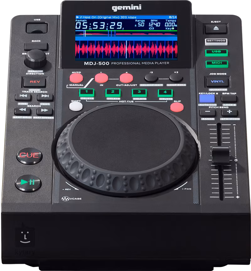 Das Gerät verfügt über eine berührungsempfindliche 8-Zoll-Jog-Plate mit einstellbarem Widerstand, den Sie genau an Ihre Bedürfnisse anpassen können. Außerdem zeigt das 4,3-Zoll-Farbdisplay alle wichtigen Informationen übersichtlich auf einen Blick an. Der MDJ-500 unterstützt die Wiedergabe von WAV-, MP3-, AAC- und AIFF-Formaten direkt von externen Speichermedien über den USB-A-Anschluss und dient außerdem als 24-Bit/192-kHz-Audio-Interface, wenn er über den USB-B-Anschluss an einen Computer angeschlossen ist.