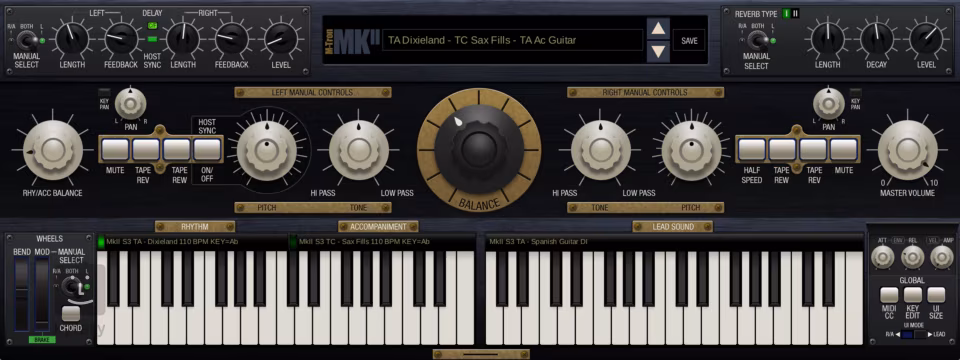 Das M-Tron Pro MkII bietet Ihnen jetzt bis zu 88 Tasten mit Aftertouch für die Live-Performance (zwei kleine MIDI-Controller können auch angeschlossen werden), 66 Rhythmen und Begleitungen, 66 Master-Sounds, zwei unabhängige Sound-Layer, ein Pitch/LFO/Envelope-Filter, 29 einstellbare Parameter, Delay, Reverb und Orchestral-Effekte oder Tape Reverse. Mehr als 700 Presets, 132 Tape-Bänke und mehr als 4500 Samples aus der Streetly Archives-Serie, in der neue Sounds, Parameter und erweiterte Einstellungen in Zusammenarbeit mit den weltweit führenden Künstlern auf Sie warten, sind übersichtlich kategorisiert. Außerdem erhalten Sie mit M-Tron MkII eine 4,72 GB große Soundbibliothek.