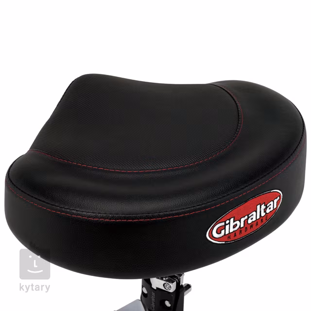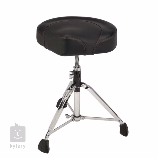 Dieser Trommelsitz mit Motorradsitz ermöglicht eine Höhenverstellbarkeit von 51 bis 69 Zoll. Das Gestell ist ein klassisches, stabiles Dreibein, der Sitz ist ehrlich gepolstert und mit Vinyl und Samt bezogen.