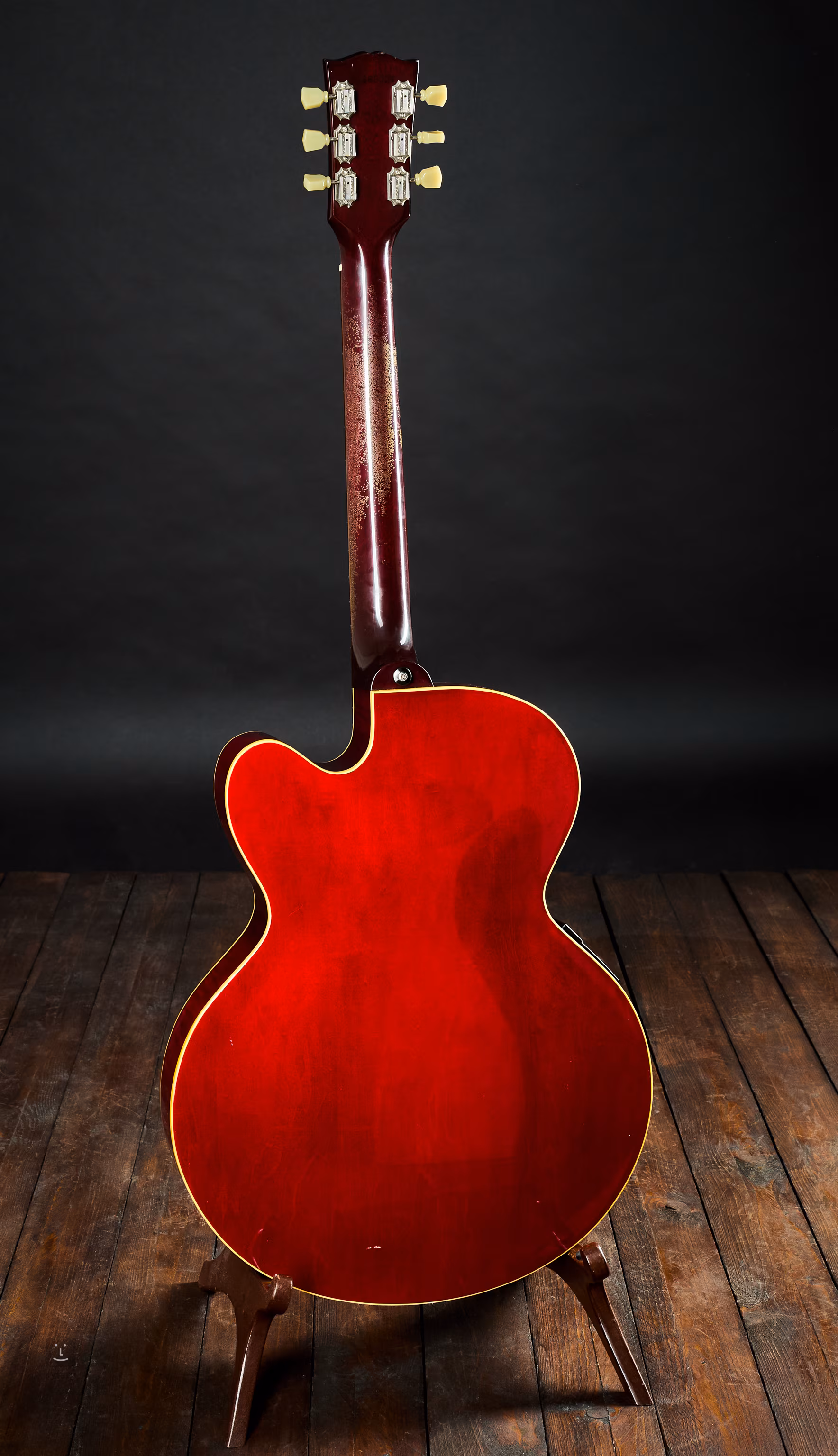 Das Instrument hat einen neueren Klinkenausgang und ein schwarzes, nicht-originales Schlagbrett, das auf den Korpus geklebt ist. Der rot-transparente Lack weist alters- und gebrauchsbedingt deutliche Flecken und Risse auf, auf der Rückseite des Halses befinden sich kosmetische Zeichnungen im Lack. Die Gitarre funktioniert jedoch einwandfrei, einschließlich der Piezo-Tonabnehmer.