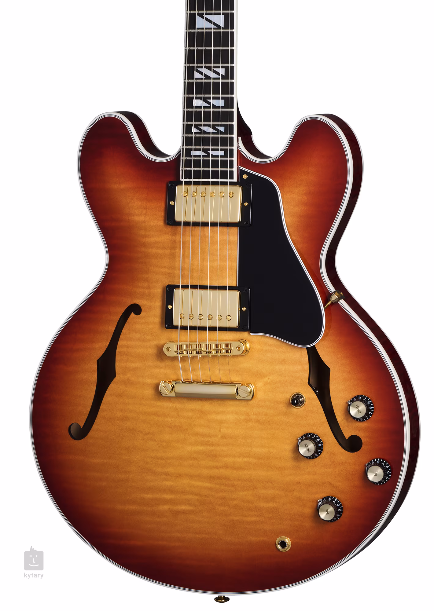 Der Korpus der ES Supreme Bourbon Burst besteht aus drei Schichten laminiertem Ahorn und Pappel, wobei die Decke aus optisch auffälligem, gemasertem AAA-Ahorn gefertigt ist. Der Resonanzboden wird durch einen Mittelblock aus massivem Ahorn verstärkt. Die Maserung des Holzes wird durch eine dünne Schicht Nitrozelluloselack akzentuiert, die das Holz atmen lässt. Auf den Mahagoni-Hals ist ein Ebenholz-Griffbrett mit zweiundzwanzig Medium-Jumbo-Bünden geleimt. Das abgerundete "C"-Halsprofil und der Compound-Radius des Griffbretts sorgen für maximalen Spielkomfort. Die Orientierung auf dem Griffbrett wird durch Positionsmarker aus Perlmutt (Mother of Pearl Super Split Block) erleichtert.