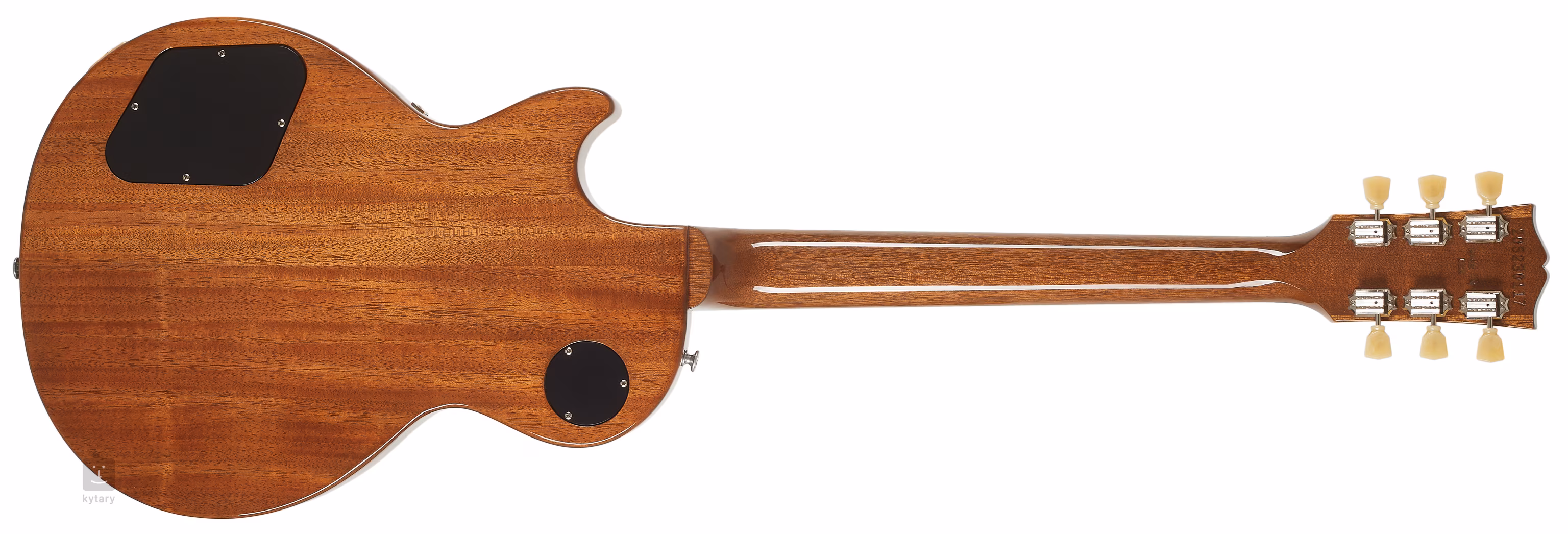 Der Mahagonikorpus der Les Paul Standard 50s Gold Top ist mit einer goldfarbenen Ahorn-Decke verziert. Eine dünne Schicht Nitrocelluloselack lässt das Holz atmen und verbessert die Klangqualität des Instruments. Auf den Mahagonihals mit abgerundetem 50s Vintage-Profil ist ein Griffbrett aus indischem Palisander aufgeklebt, das mit 22 Medium-Jumbo-Bünden bestückt ist. Die Orientierung auf dem Griffbrett erleichtern Positionsmarkierungen aus Acryl-Trapezform (Acrylic Trapezoid).