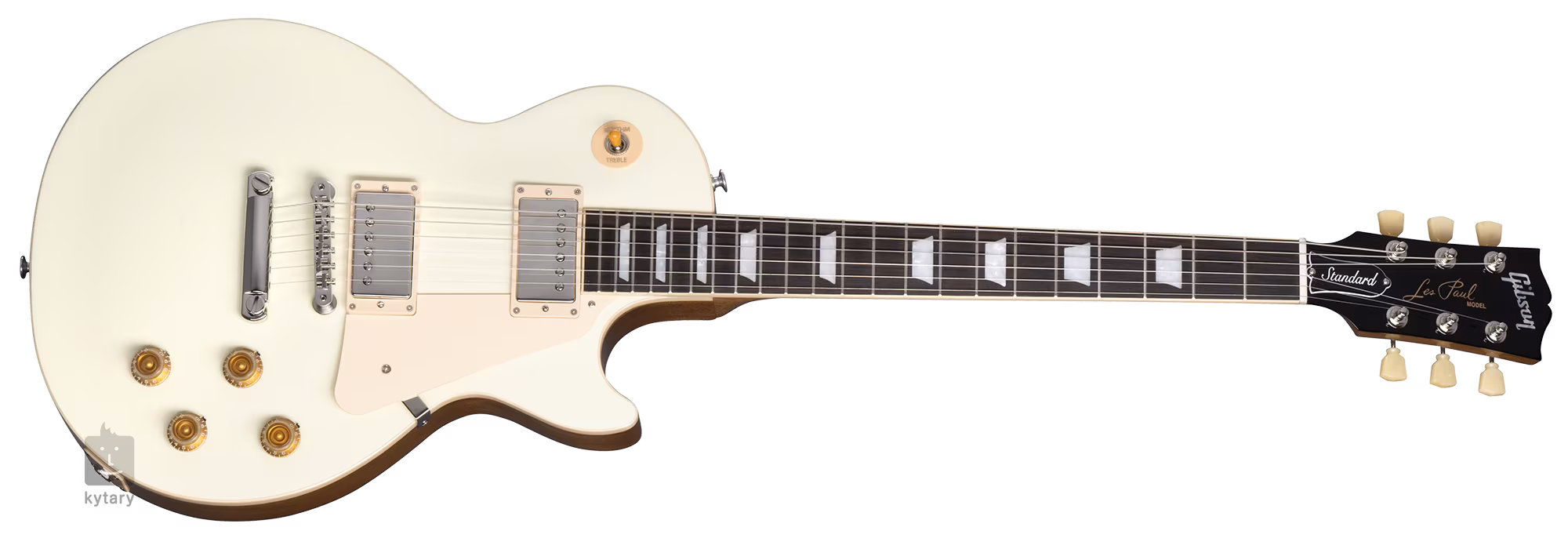 Die Les Paul Standard 50s Plain Top Classic White Top verfügt über einen Mahagonikorpus und eine Ahorndecke, die mit einer Glanzlackierung und der Farbgebung Classic White verziert ist. Auf den Mahagoni-Hals mit einem abgerundeten Vintage 50s-Profil ist ein Griffbrett aus indischem Palisander geklebt, das mit zweiundzwanzig Medium Jumbo-Bünden ausgestattet ist. Positionsblöcke aus Perlmutt-Imitat (Acryl-Trapezoid) erleichtern die Orientierung auf der Oberfläche.