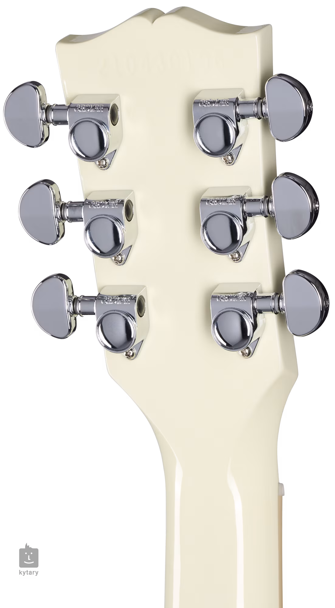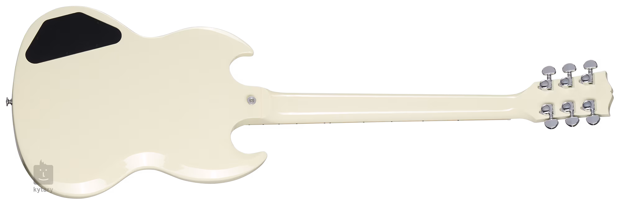 Der Mahagonikorpus der SG Standard Classic White Gitarre ist mit einer Classic White Lackierung und einer dünnen Nitrozellulose-Lackierung versehen. Auf den Mahagoni-Hals ist ein Palisander-Griffbrett mit zweiundzwanzig Medium-Jumbo-Bünden geleimt. Positionierblöcke aus Perlmuttimitat (Acryltrapez) erleichtern die Orientierung auf der Oberfläche.