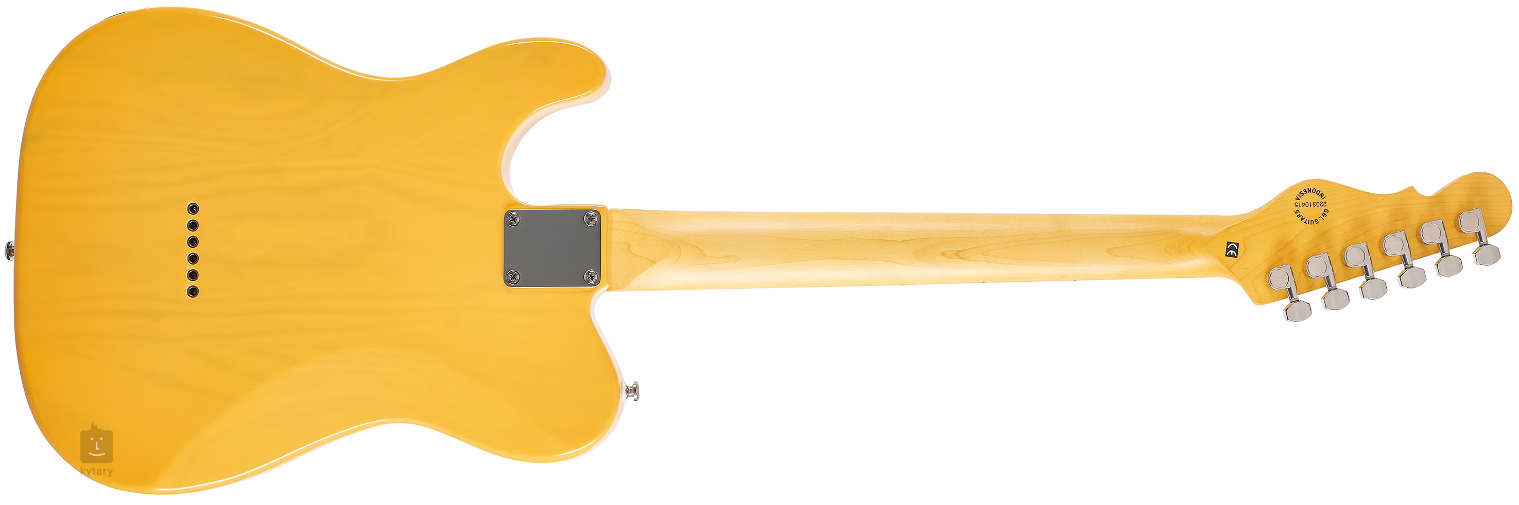 Das G&L Asat Classic E-Gitarren-Design repräsentiert Leo Fenders letztes Wort zum klassischen Single-Cut-T-Design. Das Modell Tribute ASAT Classic Butterscotch MP aus der preisgünstigeren Tribute-Serie verfügt über einen Pappelkorpus mit Esche-Decke, einen angeschraubten Ahornhals mit einem angenehmen "Medium C"-Profil und ein Ahorn-Griffbrett mit zweiundzwanzig Medium-Jumbo-Nickelbünden.