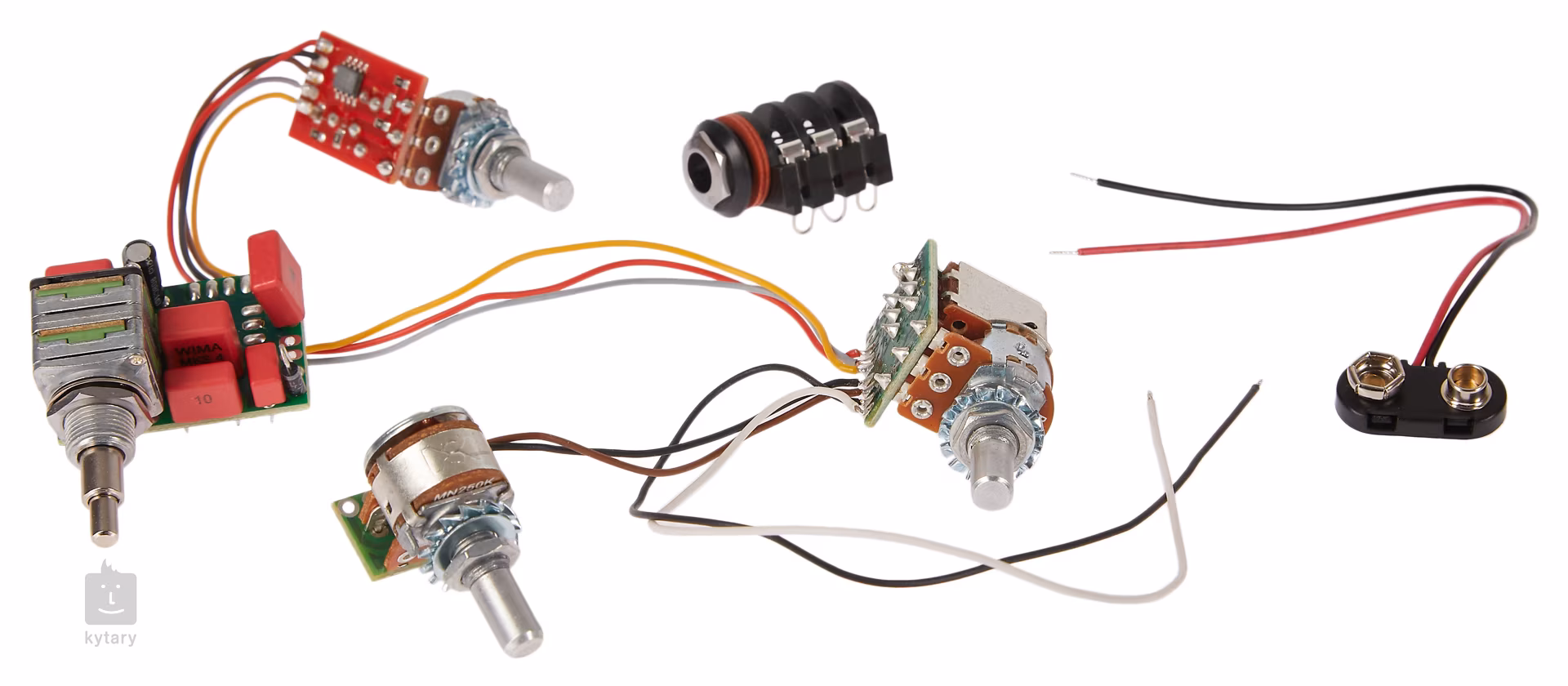 Das Dreiband-Aktiv-Elektronikmodul für E-Bässe verfügt über einen Aktiv/Passiv-Schalter am Lautstärkeregler und Mitten-/Bass-/Höhen-Potentiometer zur Einstellung der Klangfarbe. Die Stromversorgung erfolgt über eine Neun-Volt-Batterie.