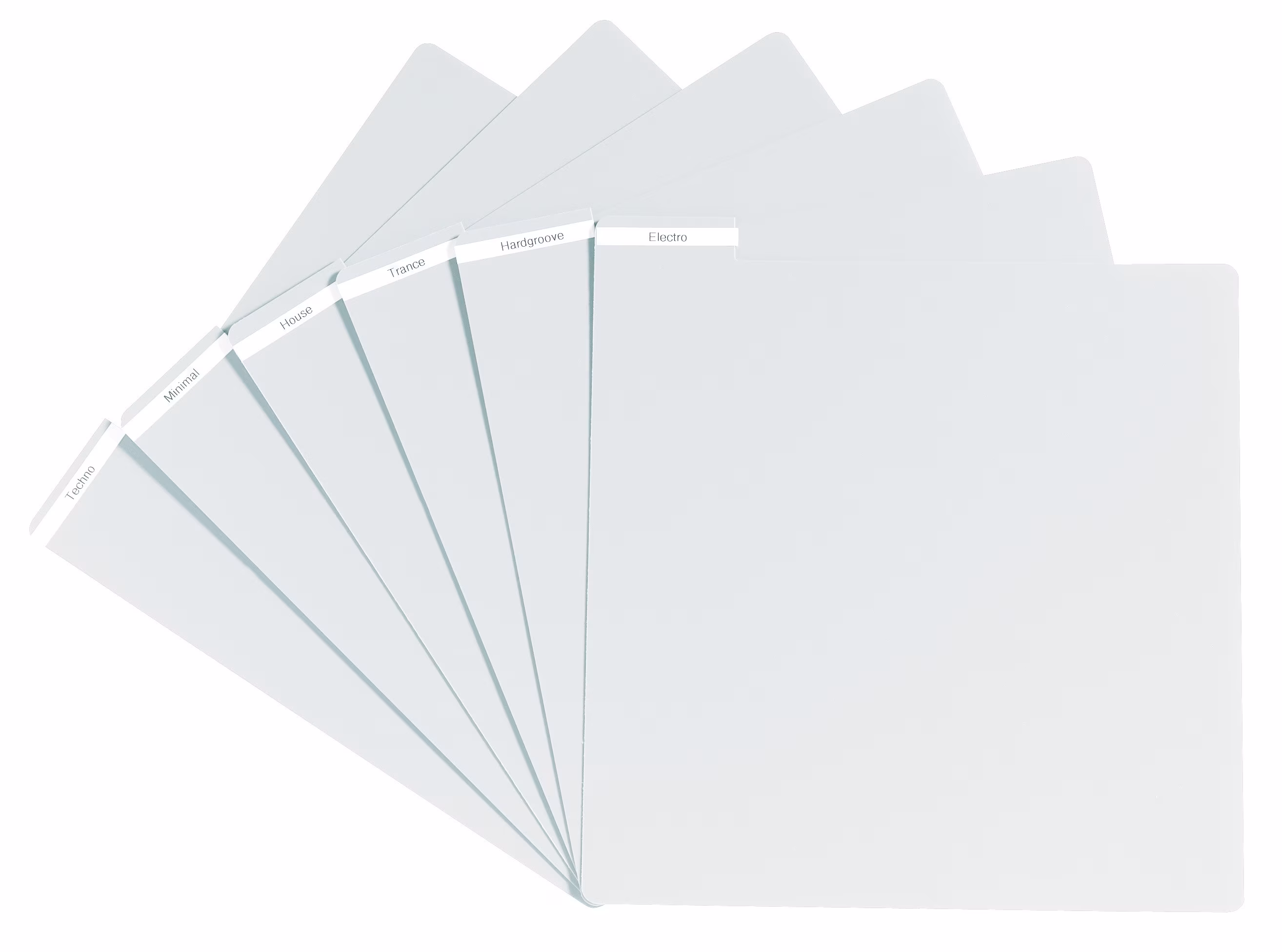 Der markante obere Teil bietet Platz für Etiketten oder Aufkleber und ermöglicht eine schnelle Orientierung auch in größeren Sammlungen. Er eignet sich nicht nur für Heimsammlungen, sondern auch für den professionellen Einsatz in Schallplattengeschäften, wo er Kunden hilft, die gesuchten Titel schnell zu finden.