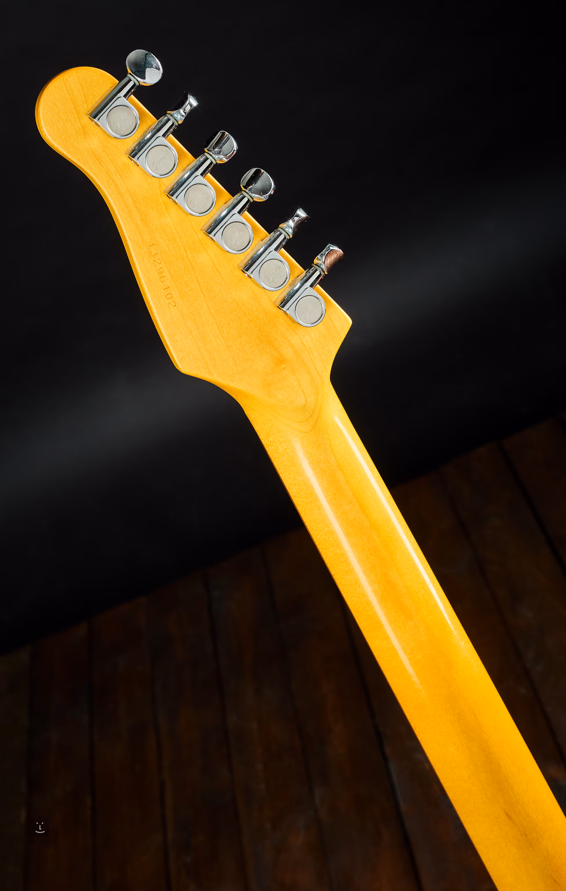 Der Korpus dieses Instruments ist aus kanadischer Linde gefertigt. Der verschraubte Hals besteht aus Ahorn. Das Griffbrett hat einen Radius von 12" und ist ebenfalls aus Ahorn gefertigt. Auf 648 Millimetern finden sich 22 Bünde. Der Nullbund hat eine Breite von 42,8 Millimetern.
