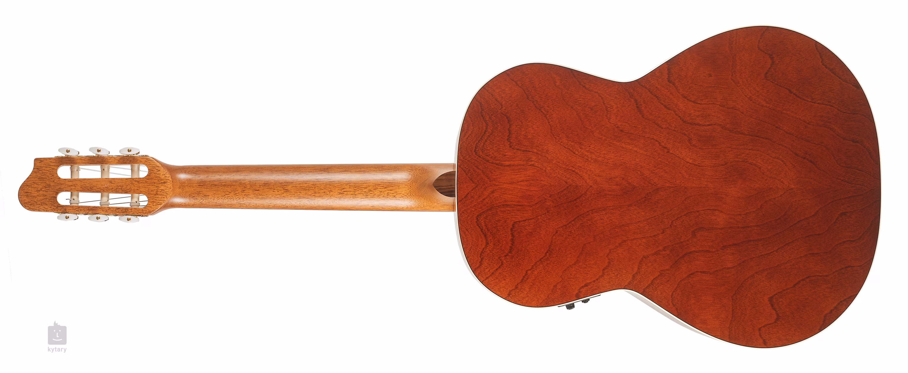 Die Vorderseite der Etude Left Clasica II besteht aus massivem Zedernholz, während der Boden und die Zargen aus massivem Kirschbaumsperrholz gefertigt sind. Auf den Mahagonihals ist ein Palisandergriffbrett mit neunzehn Bünden geleimt. Die Saiten sind über den Graphtech TusQ-Nullbund in der 14:1 Übersetzung des Unternehmens und dem Palisandergriffbrett aufgezogen. Die feine Handwerkskunst der Gitarre wird durch die halbglänzende Flared-Lackierung der Decke, das doppelseitige helle Perimeter-Binding des Korpus, das moderne Kopfplatten-Design und die dekorative Rosette unterstrichen.