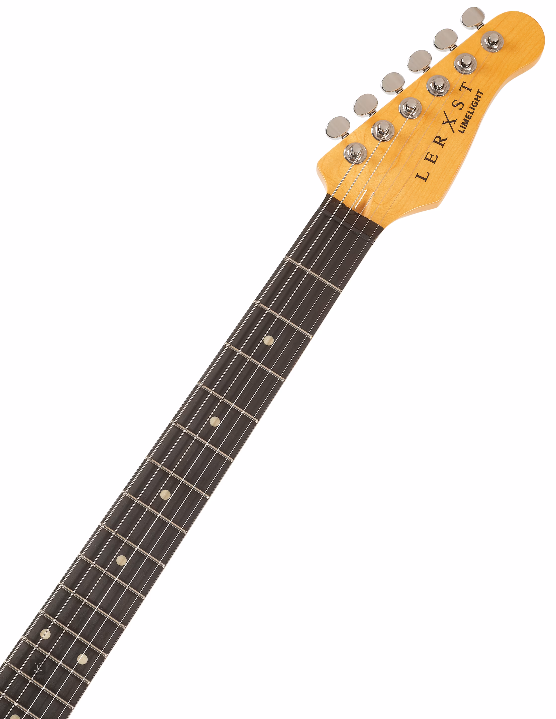 Die Lerxst Limelight E-Gitarre ist ein Signature-Modell, das in Zusammenarbeit mit dem Gitarristen Alex Lifeson von der kanadischen Band Rush entwickelt wurde. Es ist ein Instrument, das von der ST-Gitarre der 1980er Jahre inspiriert ist, die zum Synonym für Alex' Sound und Gitarrenstil geworden ist.